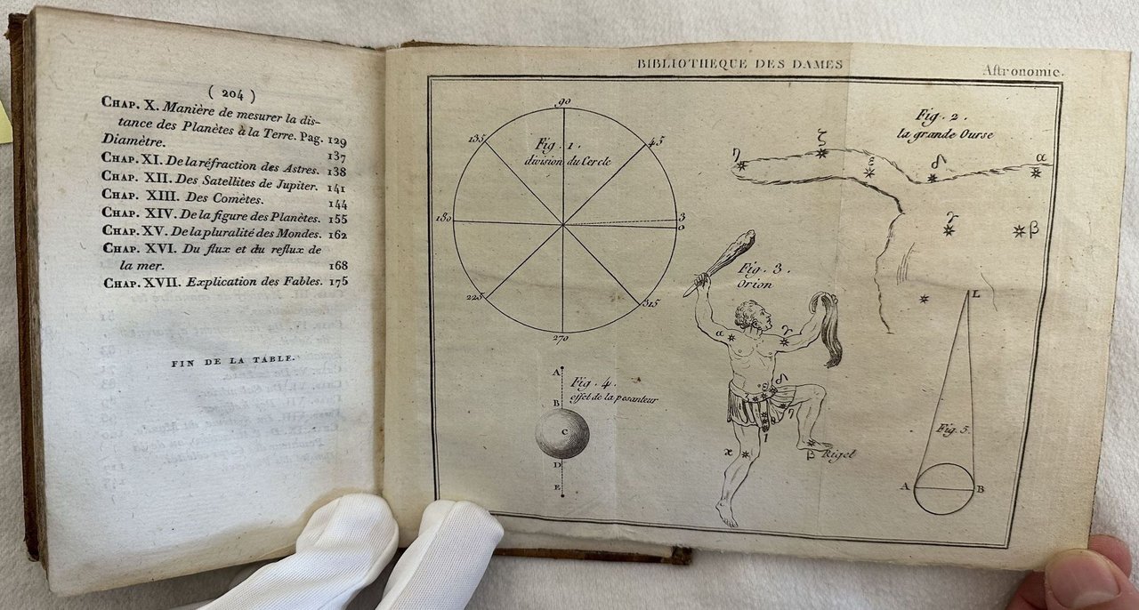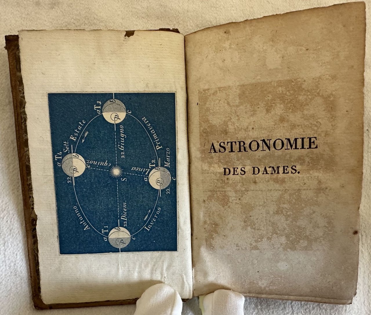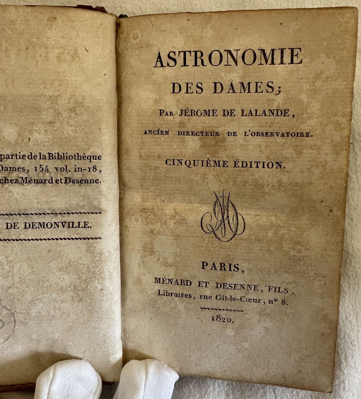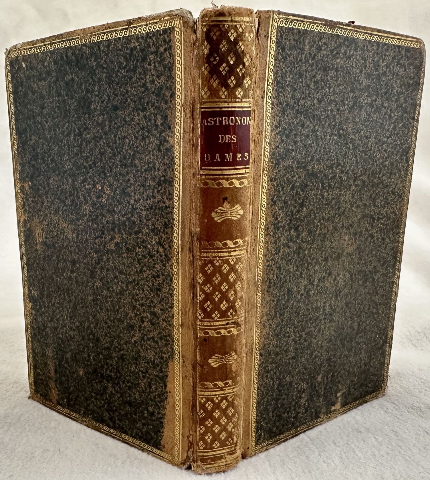 Edizione del 1820 di questa celebre operetta di divulgazione scientifica scritta da Jerome de Lalande (1732-1807) della collana "Bibliotheque des Dames". L'autore, allievo di Delisle e Lemonnier, venne da lui inviato nel 1751 a Berlino per la determinazione della parallasse lunare, avviata, nel Capo di Buona Speranza, da Nicolas Louis de Lacaille. Nel corso di un'attività prodigiosa redasse il catalogo "Histoire Celeste Franczaise" contenente le indicazioni della posizione di 47390 stelle. Insieme a John Flamstees, primo astronomo reale d'Inghilterra, fu il primo a catalogare le stelle più luminose ed un astro da lui messo a catalogo porta oggi il suo nome (stella Lalande 21185). Tra gli argomenti trattati: donne astronome, Grandezza della terra, Maniera di conoscere le costellazioni, movimento apparente del sole, equazione dei tempo (luna, calendario, eclisse, sistema del mondo, attrazione). Alla fine del volume tavola ripiegata che mostra elementi astronomici e una costellazione. Due bellissimi ex libris al contropiatto anteriore e prima pagina di sguardia. Incisione applicata al verso della prima pagina di sguardia. In buone condizioni e completo. Copertina in piena pelle coeva con titolo e decorazioni in oro al dorso in buone condizioni generali con lievi usure ai margini e dorso. Legatura in buone condizioni. Pagine in buone condizioni con fioriture. In 24. Dim. 13,5x8,5 cm. Pp. (4)+204+(6). Peso Kg. 0,124. Edition of 1820 of this famous work of scientiphic divulgation written by Jerome de Lalande (1732-1807) of the series "Bibliotheque des Dames". The issues treated: astronomical women, Size of Earth, Way to know costellation, apparent movement of the sun, equation of time (moon, calendar, eclipse, system of the world, attraction). At the end of the volume folded plate showing astronomical elements and a costellation . Two very beautiful ex libris in the front counterplate and first endpage. Engraving applied in the verso of the first endpage. In good conditions and complete. Full leather coeval cover with gilted title and decorations in the spine in good general conditions lightly worn in the extremities. Binding in good conditions. Pages are in good conditions with foxing. In 24. Dim. 13,5x8,5 cm. Pp. (4)+204+(6). Peso Kg. 0,124