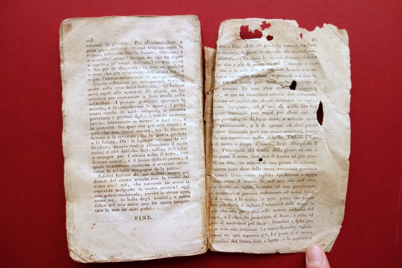 F. A. Chateaubriand, Atala ovvero gli amori di due selvaggi nel deserto di F. A. Chateaubriand versione italiana con annotazioni del traduttore Per Giovanni Silvestri, Milano 1814; cm 17,5x10,5; pp. 108; brossura d'epoca con titolo annotato a mano al dorso restaurato (restauro artigianale). Prima edizione italiana. Condizioni di conservazione Esemplare in modeste condizioni con tracce d'uso e del tempo; dorso restaurato mediante braghetta cartacea, con strappetti alla parte superiore; piatti con abrasioni e piccole mancanze. Interni con alcune piccole leggere bruniture e ombra di gora di umidità che non compromette la lettura del testo. Qualche leggera traccia di sporco all'angolo sup. di alcune pagine. Esemplare complessivamente compatto. Rara prima edizione italiana, in condizioni come da foto e da descrizione. SETT198.L19205 N P