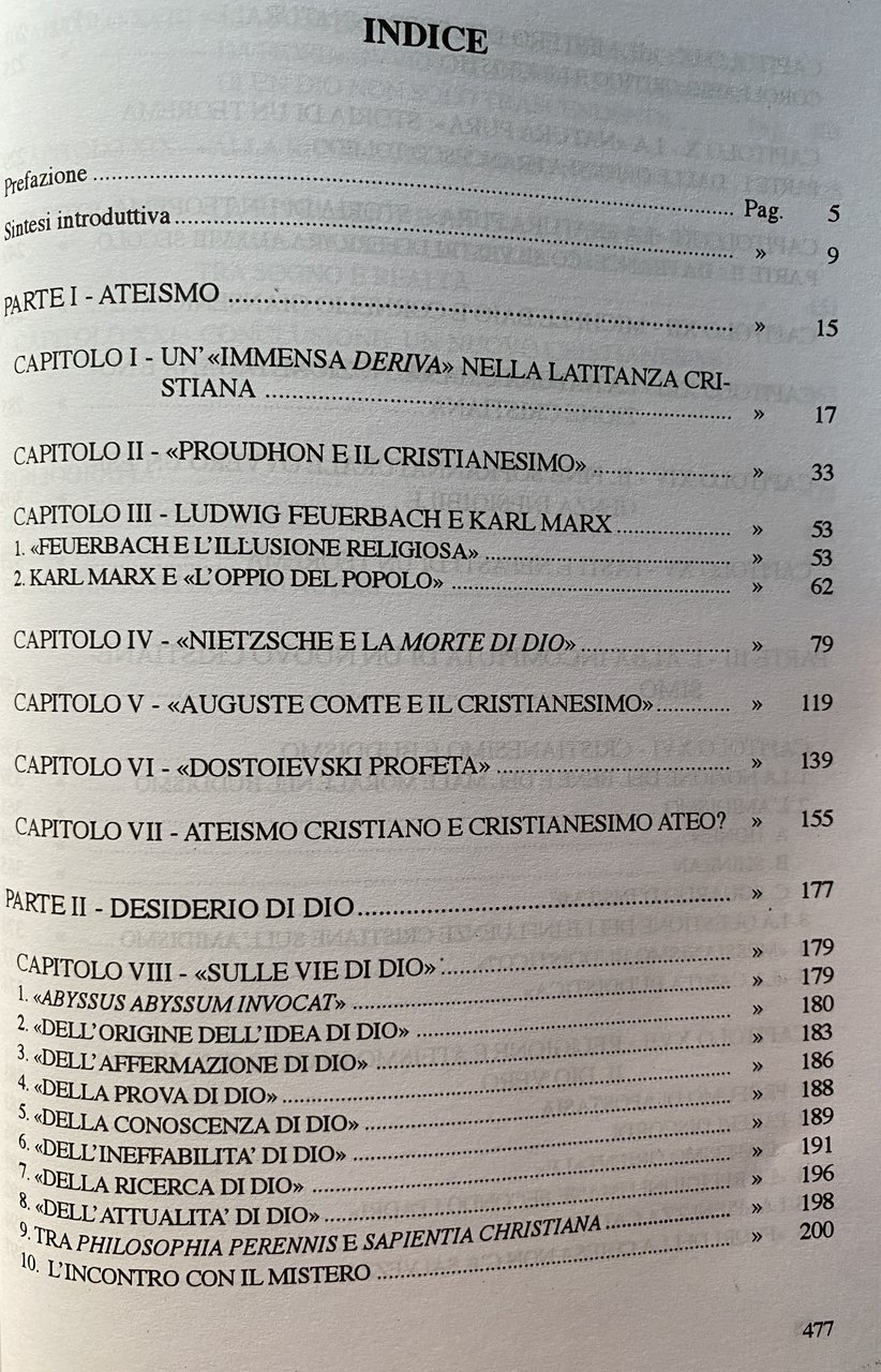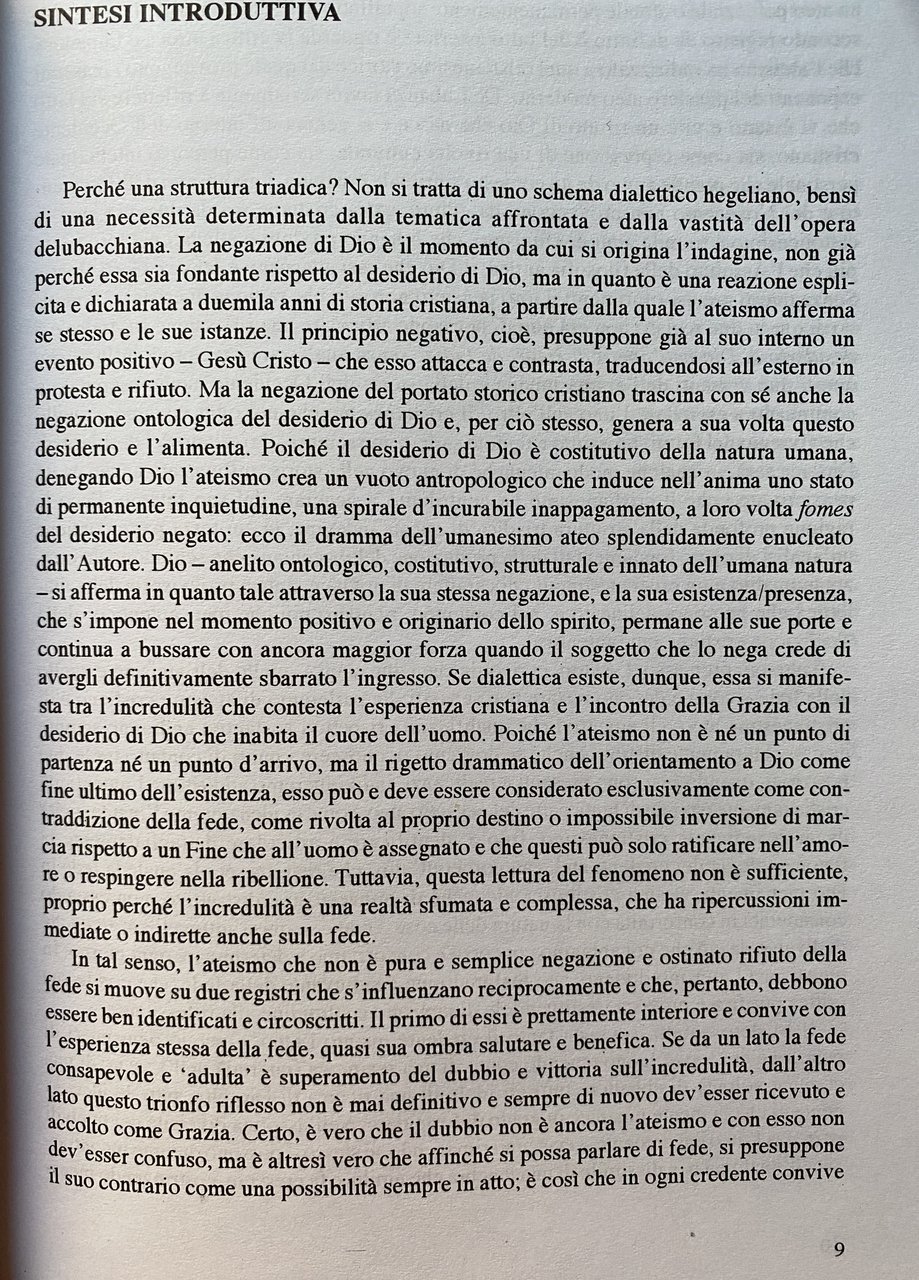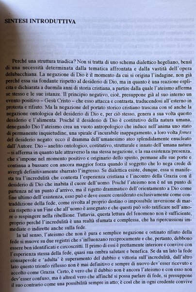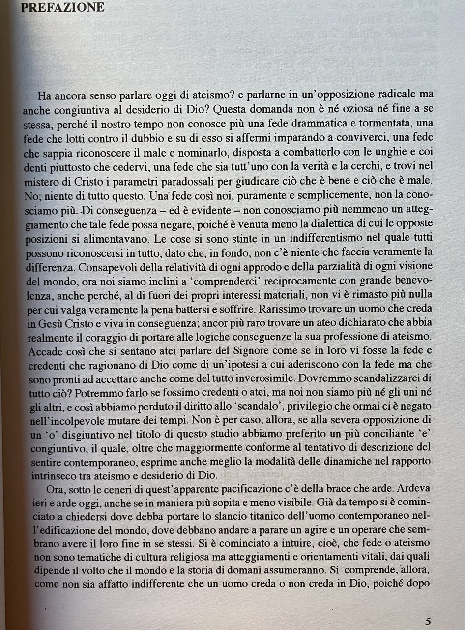 Ha ancora senso parlare oggi di ateismo? e parlarne in un'opposizione radicale ma anche congiuntiva al desiderio di Dio? Questa domanda non è né oziosa né fine a se stessa, perché il nostro tempo non conosce più una fede drammatica e tormentata, una fede che lotti contro il dubbio e su di esso si affermi imparando a conviverci, una fede che sappia riconoscere il male e nominarlo, disposta a combatterlo con le unghie e coi denti piuttosto che cedervi, una fede che sia tutt'uno con la verità e la cerchi, e trovi nel mistero di Cristo i parametri paradossali per giudicare ciò che è bene e ciò che è male. Una fede cosi noi non la conosciamo più. Le cose si sono stinte in un indifferentismo nel quale tutti possono riconoscersi in tutto, dato che, in fondo, non c'è niente che faccia veramente la differenza. Rarissimo trovare un uomo che creda in Gesù Cristo e viva in conseguenza; ancor più raro trovare un ateo dichiarato che abbia realmente il coraggio di portare alle logiche conseguenze la sua professione di ateismo. Dovremmo scandalizzarci di tutto ciò? Potremmo farlo se fossimo credenti o atei, ma noi non siamo più né gli uni né gli altri, e cosi abbiamo perduto il diritto allo scandalo, privilegio che ormai ci è negato nell'incolpevole mutare dei tempi. La nostra è un'epoca chiamata a una sintesi. Si tratta di decidere se lo sforzo prometeico che l'uomo ha compiuto nella modernità e continua a compiere con indefesso vigore debba portare da qualche parte nell'elevazione della natura umana o risponda esclusivamente a un desiderio di sopraffazione e dominio che si radica nell'istinto del potere. È ovvio che nella determinazione della direzione di questa marcia la questione se l'uomo abbia o non abbia da realizzare un valore eterno è centrale e preponderante, perché se un valore eterno da realizzare non c'è o non c'è più, occorre avere il coraggio di riconoscerlo e ammetterlo, in luogo di usare la religione per fini che non sono i suoi. Se invece un valore eterno esiste, bisogna che la fede in Dio sia in grado di progettare un futuro che sappia costituire un'alternativa credibile al gioco meschinamente tragico della sopraffazione del forte su debole. La lotta tra fede e incredulità si deciderà anche nella capacità o meno d'attuare questa prospettiva.