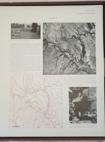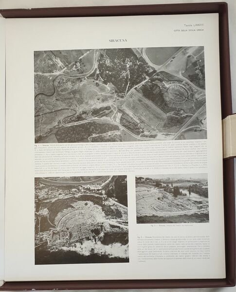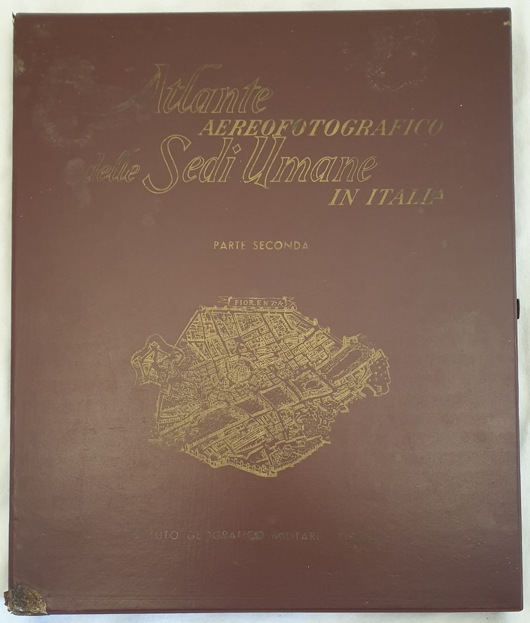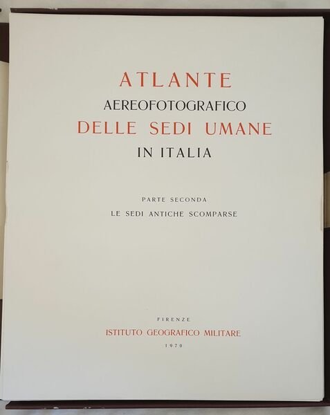 Raro atlante fotografico delle sedi antiche scomparse edito nel 1970 dall'Istituto geografico militare. Siamo in possesso della parte seconda solamente sulle sedi antiche scomparse. La raccolta è composta da 43 tavole fotografiche che mostrano fotografie aeree con didascalia. Le zone descritte: Insediamenti preistorici (Isole Eolie, villaggi sicani, Carso, Friuli, Etruria settenrionali, Castellieri dell'Umbria, Nuraghi, Villaggi nuragici), Insediamenti italici (Ardea, Satricum, Anzio, Gabii e Tellene, Civita di Artema, Norba, Pallanum e Trebula, Terravecchia di Sepino, Colle Munito e Civita Danzica, S. Erasmo di Cesi, Arpi, Cavallino, Sannace, Roccavecchia, Egnazia ecc.), Città dell'Etruria meridionale (Veio, Cere, Tarquinia, Vulci, S. Giovenale, Castello D'Asso, Blera, Norchia, Luni sul Mignone, Sovana ecc.), Citta dell'Etruria centrale (Bolsena, Saturnia), Etruria settentrionale (Roselle, Vetulonia, Populonia)Etruria padana (Marzabotto, Spina, Adria), Magna Grecia (Cuma, Ercolano, Pompei, Paestum, Velia, Palinuro, Ipponio, Locri Epizefirii, caulonia, Eraclea, MEtaponto, Serra di Vaglio), Sicilia greca (Naxos, Leontini, Megara Iblea, Siracusa, Acre, Camarina, Gela, Morgantina, Agrigento, Eraclea Minoa, Selinunte, Imera, Eloro, Alesa Arconidea, Tindari), Segesta, Citta fenicio puniche (Mozia, Lilibeo, Solunto, Nora, Tharros) Roma (Ostia, Tarracina, Minturnae e Aquinum, Cales e Teanum Sidicinum, Casinum, Telesia e Venafrum, Aeclanum e Salapia, Herdonia, Grumentum, Alba Fucens, Amitermum e Corfinium, Peltuinum, Urbs Salvia, Sentinum, Carsulae, Lucus Feroniae, Falerii Novi, Ferentium, Cosa, Luna, Veleia, Libarna e Albintimilium, Augusta Bagiennorum, Aquileia), I porti antichi (Pisa, Volterra, Vetulonia e Roselle, Talamone Cosa e Tarquinia, Pyrgi, Roma Imperiale, Civitavecchia Anzio e Terracina, Ventotene e Astura, Pozzuoli, Portus Iulius, Ravenna, Aquileia), Ville romane (Villa Adriana, Ville di Sirmione e delle Grottacee, delle Grotte, Ville sepolte rivelate dalla fotografia aerea). All’interno una pubblicazione edito dell’Istituto geografico militare, una serie di 30 tavole. Cofanetto in pelle editoriale. In ottime condizioni. Cofanetto in pelle editoriale in buone condizioni generali con usure marginali. Legatura assente. Pagine in ottime condizioni generali. In folio. Dim. 52x42,5 cm. Pp. 10+(2)+CXLIII. Peso Kg. 10 Scarce photographic atlas of antique disappeared places edited in 1970 by Istituto geografico militare. We only have the second part only about hidden antique places. The collection includes 43 photographic plates featuring air photoes with didascalia. The areas described: Insediamenti preistorici (Isole Eolie, villaggi sicani, Carso, Friuli, Etruria settenrionali, Castellieri dell'Umbria, Nuraghi, Villaggi nuragici), Insediamenti italici (Ardea, Satricum, Anzio, Gabii e Tellene, Civita di Artema, Norba, Pallanum e Trebula, Terravecchia di Sepino, Colle Munito e Civita Danzica, S. Erasmo di Cesi, Arpi, Cavallino, Sannace, Roccavecchia, Egnazia ecc.), Città dell'Etruria meridionale (Veio, Cere, Tarquinia, Vulci, S. Giovenale, Castello D'Asso, Blera, Norchia, Luni sul Mignone, Sovana ecc.), Citta dell'Etruria centrale (Bolsena, Saturnia), Etruria settentrionale (Roselle, Vetulonia, Populonia)Etruria padana (Marzabotto, Spina, Adria), Magna Grecia (Cuma, Ercolano, Pompei, Paestum, Velia, Palinuro, Ipponio, Locri Epizefirii, caulonia, Eraclea, MEtaponto, Serra di Vaglio), Sicilia greca (Naxos, Leontini, Megara Iblea, Siracusa, Acre, Camarina, Gela, Morgantina, Agrigento, Eraclea Minoa, Selinunte, Imera, Eloro, Alesa Arconidea, Tindari), Segesta, Citta fenicio puniche (Mozia, Lilibeo, Solunto, Nora, Tharros) Roma (Ostia, Tarracina, Minturnae e Aquinum, Cales e Teanum Sidicinum, Casinum, Telesia e Venafrum, Aeclanum e Salapia, Herdonia, Grumentum, Alba Fucens, Amitermum e Corfinium, Peltuinum, Urbs Salvia, Sentinum, Carsulae, Lucus Feroniae, Falerii Novi, Ferentium, Cosa, Luna, Veleia, Libarna e Albintimilium, Augusta Bagiennorum, Aquileia), I porti antichi (Pisa, Volterra, Vetulonia e Roselle, Talamone Cosa e Tarquinia, Pyrgi, Roma Imperiale, Civitavecchia Anzio e Terracina, Ventotene e Astura, Pozzuoli, Portus Iulius, Ravenna, Aquileia), Ville romane (Villa Adriana, Ville di Sirmione e delle Grottacee, delle Grotte, Ville sepolte rivelate dalla fotografia aerea). Case in editorial leather. In very good conditions. Case in editorial elather in good conditions with wearings in the extremities. Binding lacks. Inside pages are in very good conditionsIn folio. Dim. 52x42,5 cm. Pp. 10+(2)+CXLIII. Peso Kg. 10