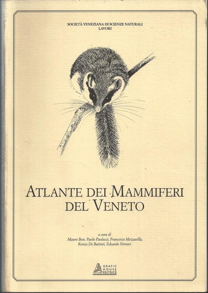 Atlante dei mammiferi del Veneto, a cura di Mauro Bon et al., Grafic House Editrice, Mestre 1996, pp. 132, ill. b.n., cm 24, br. ed. In testa al frontespizio: Società Veneziana di Scienze Naturali. Lavori. Collana Aspetti Naturalistici Veneti, n. 2. Il volume è il supplemento del periodico Lavori della Società Veneziana di Scienze Naturali, vol. 21. Curatori: Mauro Bon, Paolo Paolucci, Francesco Mezzavilla, Renzo De Battisti, Edoardo Vernier. Lievissime tracce d’uso alla brossura, minima ingiallitura della carta, per altro perfetto.