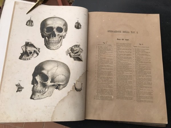 In folio (cm. 37,5), legatura coeva in Mz. Pelle con titolo e fregi oro al dorso; pp. 1 c.b., occhietto, front, 1 c. n.n. con prefazione + 38 tavole litografiche a colori, ognuna con con legenda stampata su due facciate a fronte, indice di 20 pp. n.n., 1 c.b. Le tavole sono quelle originali stampate a Lipsia. Legatura un po' usurata, sguardie rifatte, carte uniformemente brunite, gora di umidità regressa alle prime carte. Nel complesse buon esemplare di questo raro atlante in uso presso le università del tempo.