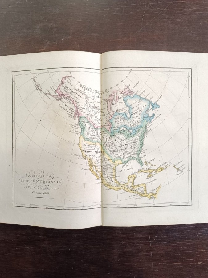 In-4° (cm. 28), legatura coeva in mezza pelle bordeaux con titolo e fregi in oro al dorso (lievi tracce d'uso); pp. [4] con 25 tavole a doppia pagina in stato molto buono (alcune fioriture). Atlante diviso in due parti, la prima Moderna e la seconda Antica, con un totale di 25 carte geografiche incise su acciaio a colori a doppia pagina, non 24 come indicato nel frontespizio poiché l'America è divisa tra Settentrionale e Meridionale. Non comune. Buon esemplare. (ND7)