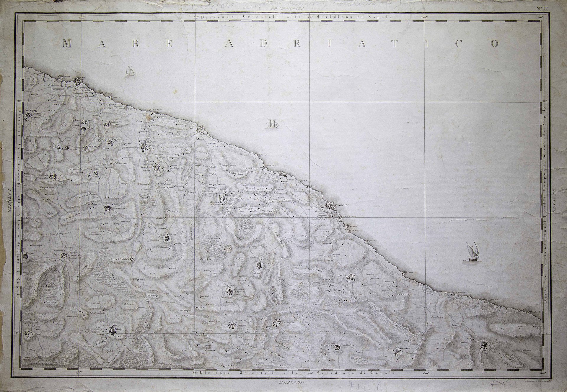 Da questo famosissimo atlante (il primo lavoro cartografico completo sul Regno redatto scientificamente e promosso da Ferdinando Galiani) di misure In folio atlantico di mm. 800 x 550 (=lxh). Tavole eseguite all`acquaforte e finite al bulino da Gius. Guerra con data e firma dell`incisore in basso a destra. Tavola n. 17 Puglia: Bari, Ostumi, Fasano, Monopoli, Mola, Modugno, ecc. ecc. Ampi aloni di vecchia umidit‡.