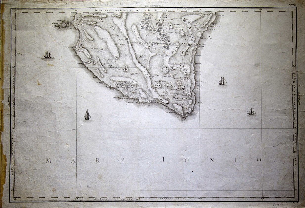 Da questo famosissimo atlante (il primo lavoro cartografico completo sul Regno redatto scientificamente e promosso da Ferdinando Galiani), di misure In folio atlantico di mm. 800 x 550 (=lxh). Tavole eseguite all`acquaforte e finite al bulino da Gius. Guerra con data e firma dell`incisore in basso a destra. Tavola n. 23 Puglia: Gallipoli, S. Maria di Leuca, Ugento ecc. ecc. Ampi aloni di vecchia umidit‡.