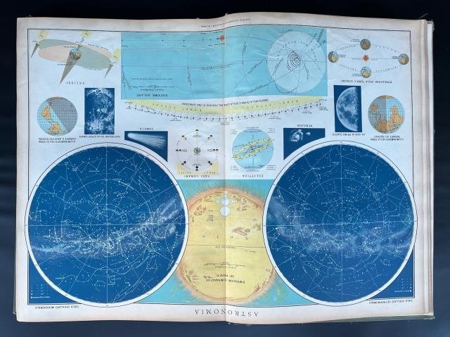 Sperling & Kupfer già Librai di S. M. La regina Madre Soc. An. It. Milano, 1938 - XVII. III edizione. In folio, front. in rosso / nero, contropiatti e fogli di guardia in carta verde. Commento Introduttivo e Indice dei 65.000 nomi. Con 104 tavole + 1 tavola di astronomia + 200 carte e cartine di geografia fisica, politica ed economica. Belle le tavole e in special modo quella di astronomia e le due degli emisferi (da sole valgono l'intero volume). Legatura con mancanze al dorso e tela ai piatti leggermente usurata dal tempo, ottimo l'interno con tutte le tavole.