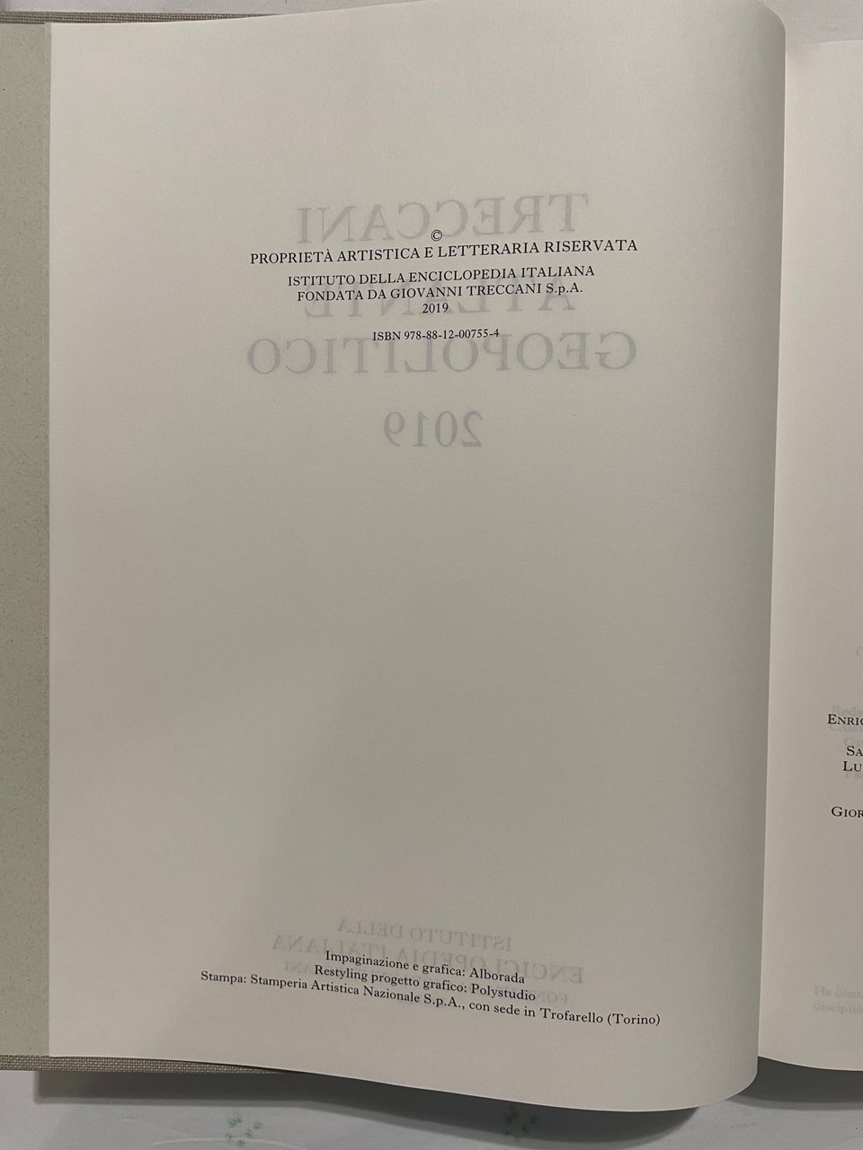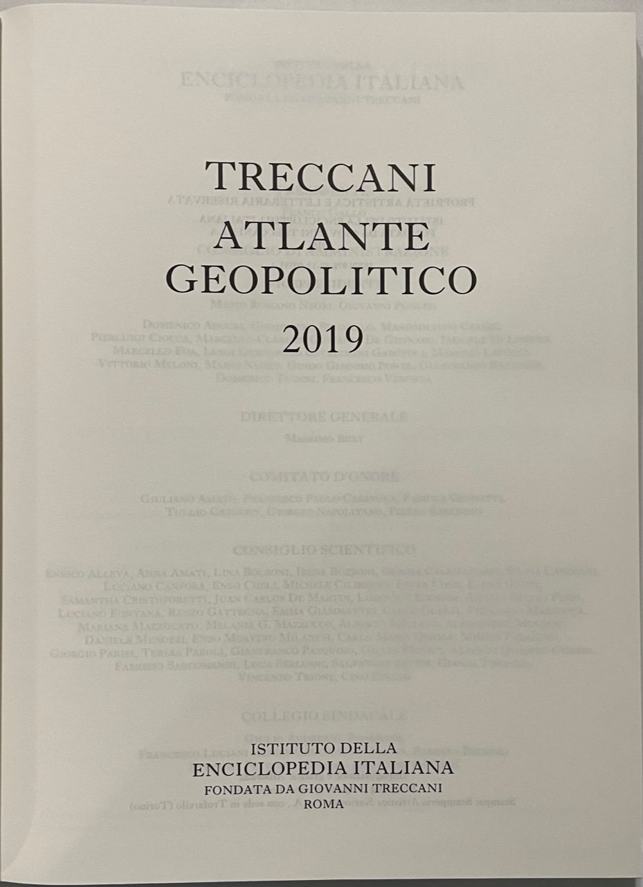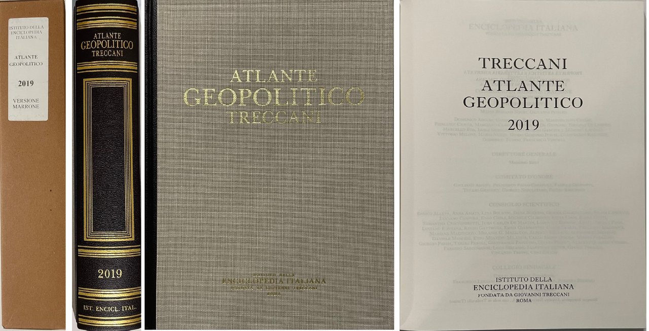 Atlante Geopolitico 2019. Istituto dell’Enciclopedia Italiana Treccani, Roma, 2019. Opera condivisa con l’Istituto per gli studi di politica internazionale (ISPI). Legatura in mezza pelle e tela. Condizioni da nuovo.