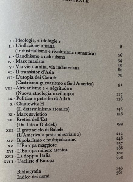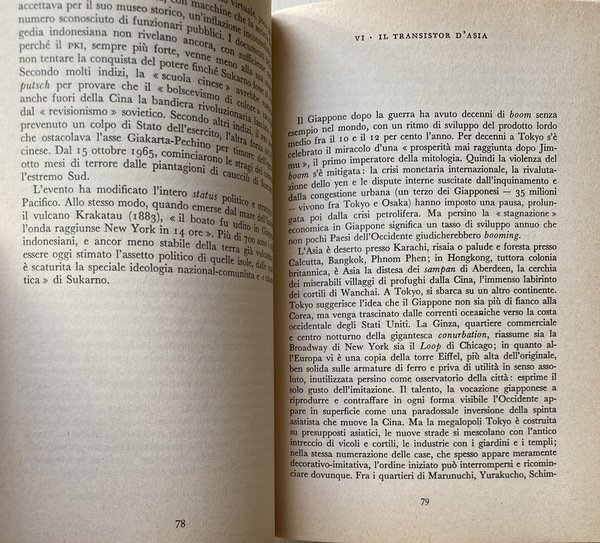 Soggetti: Giornalismo, Politica italiana, Corriere della Sera, Ideologie politiche, Novecento, Filosofia, Marxismo, Comunismo, Dittature, Totalitarismo, Fascismo, Partiti politici, Pensiero politico, Storia contemporanea, Articoli, Editoriali, Critica, Reportage, Viaggio, Guerra Fredda, Unione Sovietica, Partito comunista, Fattore k, USA-URSS, The Two Red Giants: An Analysis of Sino-Soviet Relations, Relazioni internazionali, Democrazia, Capitalismo, Socialismo, Terzo Mondo, Maoismo, Guevarismo, Keynesismo, Kennedy, Cuba, India, Cina, Europa, Italia, Sinistra, Cultura di massa, Economia, Dipendenza, Libertà, Industria, Rivoluzione, Marx, Engels, Mao Tse-Tung, Che-Guevara, Fidel Castro, Gandhi, Nehru, Asia, CARAIBI, Africa, Africanismo, Négritude, Etnologia, Sud America, Determinismo atomico, Est, Indonesia, Nucleare, Armamenti, Militarismo, Guerre, Potere, Tito, Dubcek, Stalin, Chruscev, Papandreu, Patto di Varsavia, Maggio 1968, Sessantotto, Movimento studentesco, Rivolte, Femminismo, Antiautoritarismo, Patriarcato, Famiglia, Borghesia, Intellettuali, Maestri, Sorbona, Parigi, Primavera di Praga, Kahn, Plechanov, Zbigniew Brzezinski, John Kenneth Galbraith, Società tecnetronica, Macchine, Automazione, Cibernetica, élite rurale-aristocratica, Finanza, Plutocrazia, Hitler, Brandt, Resistenza, Tedeschi, Ungheria, De Gaulle, Nazionalismo, Gollismo, Raymond Aron, Antonio de Oliveira Salazar, Fernand Braudel, Ricardo, Watergate, Reaganismo, Daniel Bell, Malthus, Carrarmati, Biafra, Nigeria, Katanga, Mosca, Russia, Gizenga, Faruk, Egitto, Lenin, Clausewitz, Mikhail Suslov, Pechino, Khrushchev, Jenmin Jih Pao, Nasser, Maometto, Bipolarismo, Bakunin, Adorno, Althusser, Arafat, Israele, Palestina, Medio Oriente, Geopolitica, Equilibrio, Jemolo, Gramsci, Spriano, Togliatti, Berlinguer, Marcuse, McLuhan, Toynbee, Bettiza, Lowenthal, Blackett, Kahn, Lévy-Strauss, Fanon, Debray, Delgado, Chesneaux, Snow, Collotti-Pischel, Schoelcher, Dobb, Lacoste, Gheddafi, Libia, Hegel, Marshall, NATO, Patto Atlantico, Cortina di ferro, Glasnost, Roosevelt, Deterrenza, Bomba, Basil Liddell Hart, Horkheimer, Kissinger, Schlesinger, Carter, Afghanistan, Solženicyn, Gulag, Trockij, Brežnev, Orwell, Koestler, Gide, Serge, Merleau-Ponty, Sweezy, Multipolarismo, Petrolio, Islam, Allah, Giganti malati, Religione, Bibliografia, Riferimento, Collezionismo, Libri Vintage fuori catalogo, Anni Quaranta, Anni Cinquanta, Anni Sessanta, Anni Settanta, Journalism, Italian politics, Corriere della Sera, Political ideologies, 20th century, Philosophy, Marxism, Communism, Dictatorships, Totalitarianism, Fascism, Political parties, Political thought, Contemporary history, Articles, Editorials, Criticism, Journey, Cold War, Soviet Union, Party Communist, K-factor, International relations, Democracy, Capitalism, Socialism, Third world, Maoism, Guevarism, Keynesianism, China, Europe, Italy, Left, Mass culture, Economy, Addiction, Freedom, Industry, Revolution, Caribbean, Africanism, Ethnology, South America, Atomic determinism, East, Armaments, Militarism, Wars, Power, Warsaw, May 68, Sixty-eight, Student movement, Revolts, Feminism, Anti-authoritarianism, Patriarchy, Family, Bourgeoisie, Intellectuals, Masters, Sorbonne, Paris, Prague Spring, Technetronic Society, Machines, Automation, Cybernetics, rural-aristocratic elite, Finance, Plutocracy, Resistance, Germans, Hungary, Nationalism, Gaullism, Tanks, Moscow, Egypt, Beijing, Mohammed, Bipolarism, Adorno, Althusser, Israel, Palestine, Middle East, Geopolitics, Balance, Libya, Atlantic Pact, Iron Curtain, Deterrence, Bomb, Multipolarity, Oil, Sick Giants, Religion, Bibliography, Reference, Collectables, Out-of-print books, Forties, Fifties, Sixties, Seventies