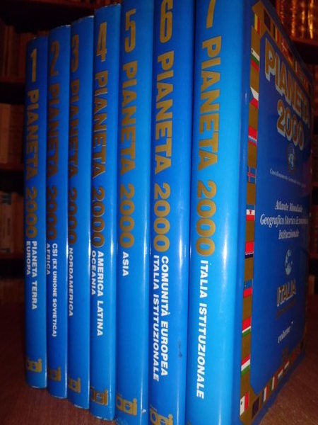 Coordinamento generale Folco Quilici. Autori vari. Milano, Nuova CEI (Pasquale Buccomino), 1992. 7 volumi in-4°, simil pelle bordeaux e titoli in oro sui piani e nei dorsi con le sovracopertine. Volume 1: Cronologia mndiale. Pianeta terra Europa. xii, 292 pp. Volume secondo: Comunità di stati indipendenti (CSI) (Ex Unione Sovietica). Africa. ix, 262 pp. Volume terzo: Nordamerica - Canada - Groenlandia - Stati Uniti. ix, 234 pp. Volume quarto: America Latina - Oceania - Australia. ix, 199 pp. Volume quinto: Asia - Stati e territori dipendenti nel 1992. ix, 264 pp. Volume sesto: Le Istituzioni della Comunità Europea - Le Istituzioni della Repubblica Italiana. Volume settimo: Le Istituzioni, il Governo e l' Amministrazione dello Stato. xi. (volume sesto e volume settimo complessive 527 pp.). In tutti i volumi che sono in ottimo stato di conservazione sono presenti innumerevoli illustrazioni a colori nel testo. Neg. magazz. mob. grigio
