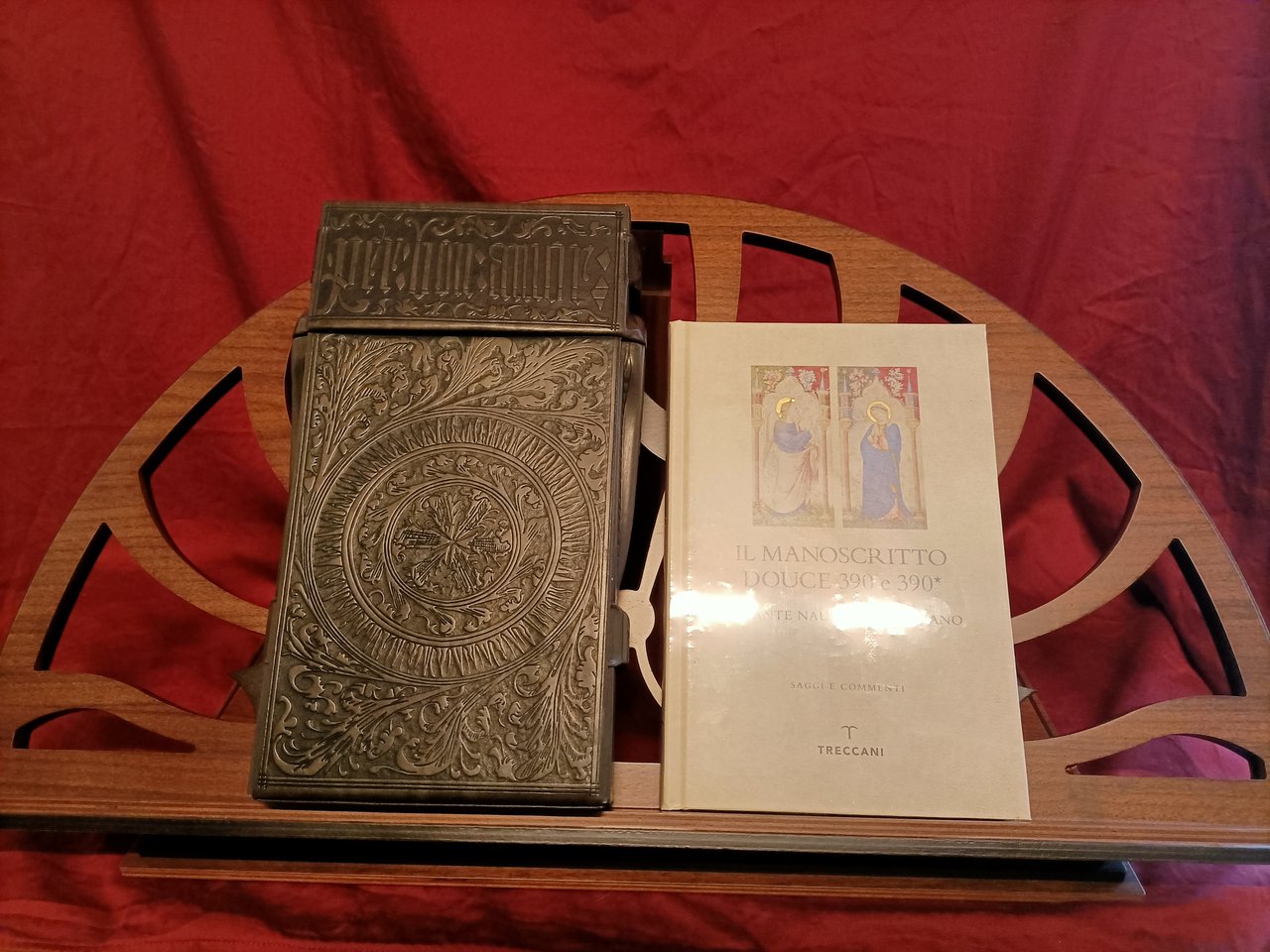 Il facsimile riproduce l’atlante nautico formato da dieci tavolette lignee sulle quali sono incollate sette pergamene di carte marine e due pergamene figurate. L’atlante nautico Douce 390 prodotto a Venezia tra l’ultimo quarto del Trecento e il primo quarto del Quattrocento rappresenta un esempio tipico dello stile italiano che caratterizza le carte nautiche di quel periodo, come affermato da Piero Falchetta nel commentario che accompagna il facsimile. Le sette pergamene di carte marine che compongono l’atlante vanno dal Mar Nero al Mediterraneo, arrivando a coprire anche l’arcipelago britannico oltre la Manica. Di straordinaria bellezza appaiono, inoltre, le tavolette che costituiscono il piatto anteriore e quello posteriore, le quali presentano eleganti decorazioni a intarsio in avorio e legno, a formare figure poligonali e stellate di gusto moresco.