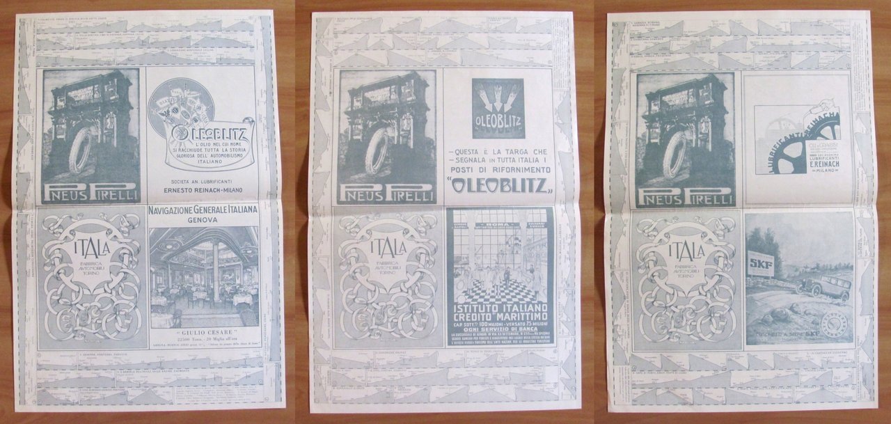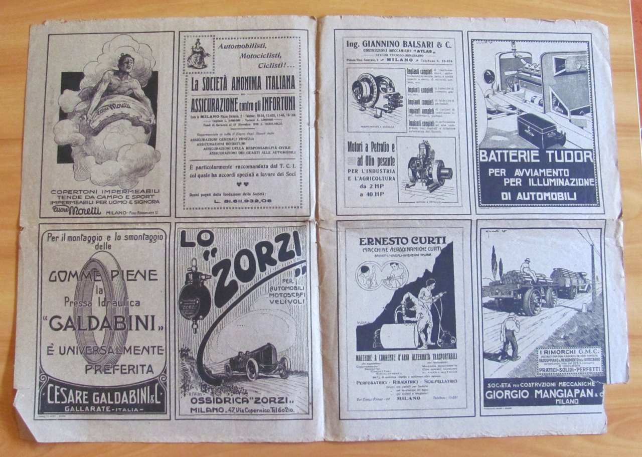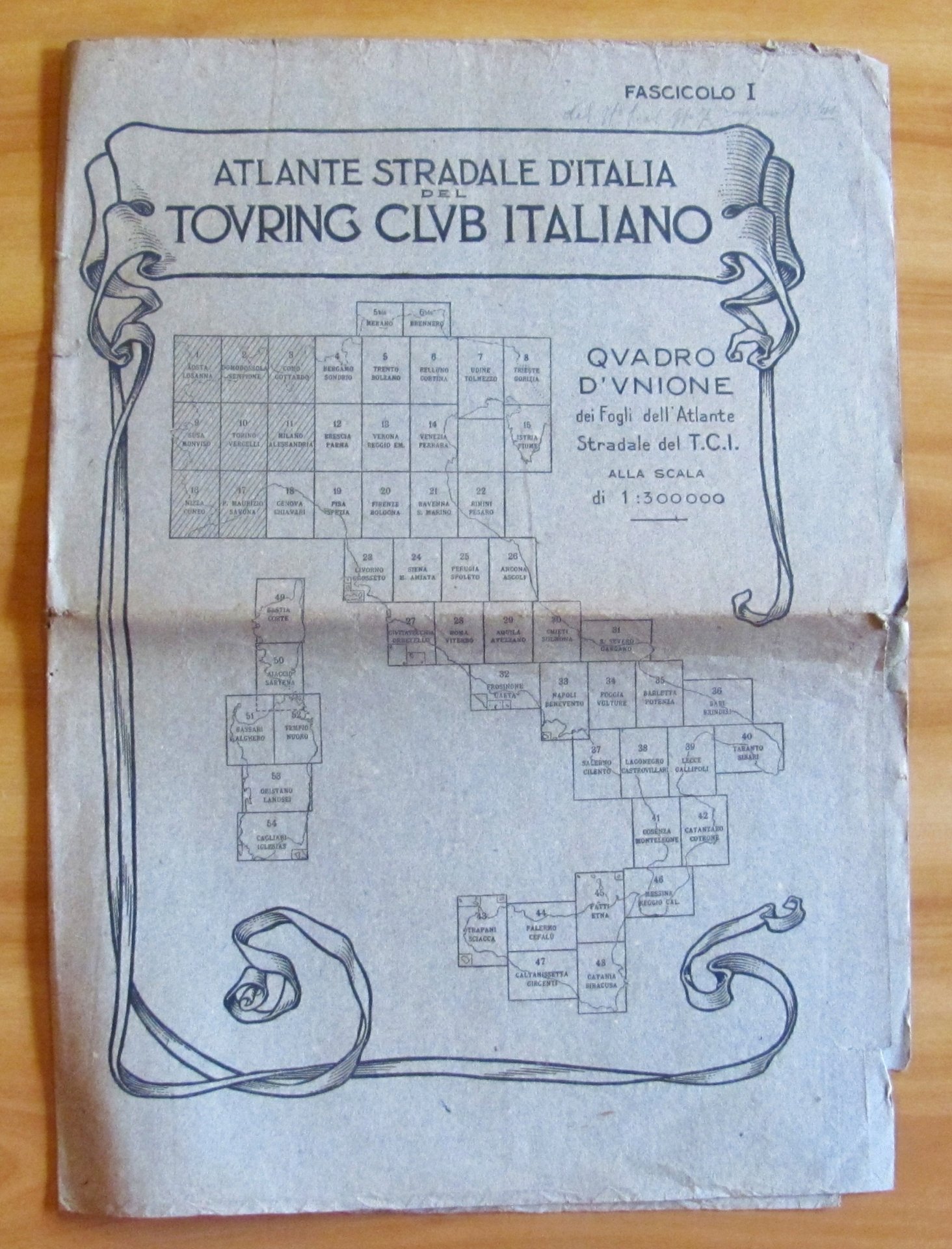 Atlante Stradale d'Italia del Touring Club Italiano - Fascicolo I - Quadro d'unione dei Fogli dell'Atlante Stradale del T.C.I. alla Scala di 1:300000. 8 belle tavole a colori N.1, 2, 3, 4, 5, 5bis, 6, 7 con belle pubblicità d'epoca al retro in tinta. Edito dal Touring Club Italiano, s.d. anni '20. Cartellina editoriale con imperfezioni, mancanze e piega centrale contenente le 8 tavole, anch'esse con leggera piega centrale, ma freschissime. 34x48, Rara e in Buonissimo stato. , Molto buono (Very Good)