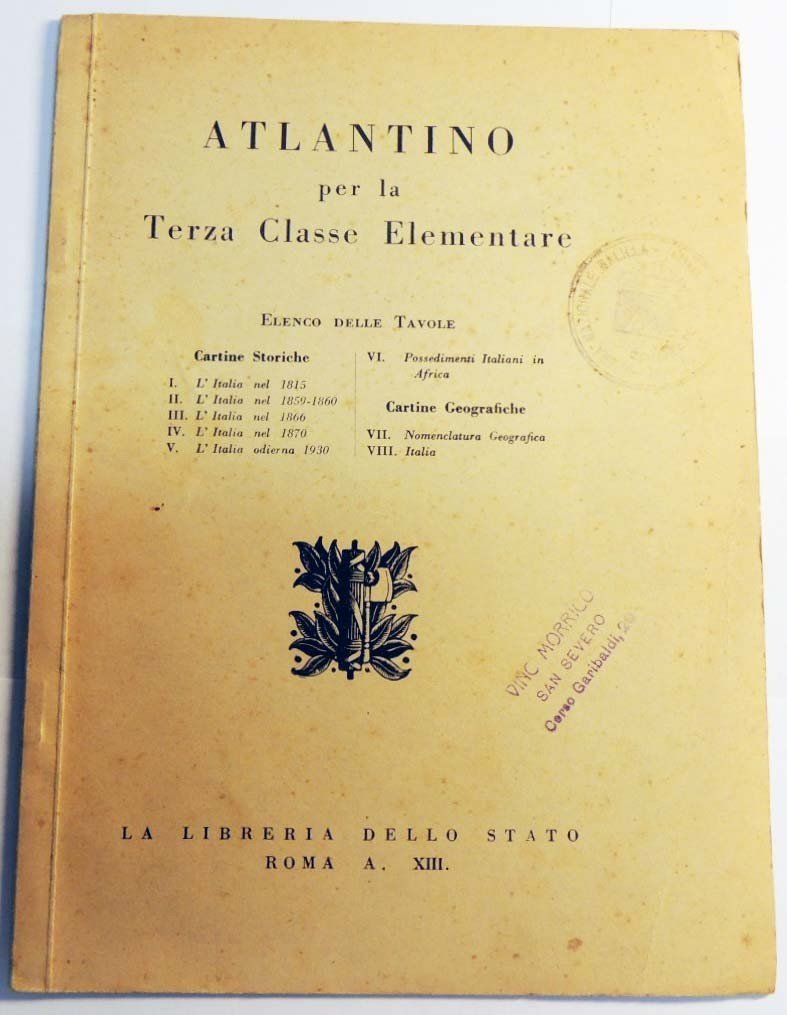 Atlantino per la terza classe elementare, La Libreria dello Stato, Roma s.d. (1934), cm 22, 8 c. topografiche col. non numerate di cui una ripiegata. Atlante di corredo al “Libro di Insegnamenti vari della Terza classe elementare”. Elenco delle tavole. Cartine storiche: L'Italia nel 1815 - L'Italia nel 1859-1860 - L'Italia nel 1866 - L'Italia nel 1870 - L'Italia odierna 1930 - Possedimenti italiani in Africa. Cartine geografiche: Nomenclatura geografica - Italia. In copertina, timbro del Comitato Comunale di Poggio Imperiale dell' Opera Nazionale Balilla e timbro d'appartenenza. Minimi segni del tempo, per il resto buon esemplare.