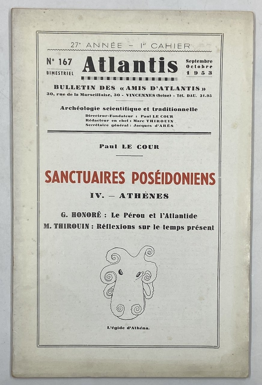 Brossura editoriale spillata, cm 16x24. Periodico fondato nel 1927 da Paul Le Cour e da lui diretto fino alla morte, quando le redini della rivista passarono a Marc Thirouin e Jacques d’Ars (Anjourand). Il sottotitolo della testata talvolta indica “Bulletin des «Amis d’Atlantis». Archeologie scientifique et traditionnelle.” Quarto articolo di Le Cour della serie dedicata ai templi greci precristiani, su Atene; inoltre G. Honoré su Atlantide e Perù e Reflexions sur le temps présent di M. Thirouin.