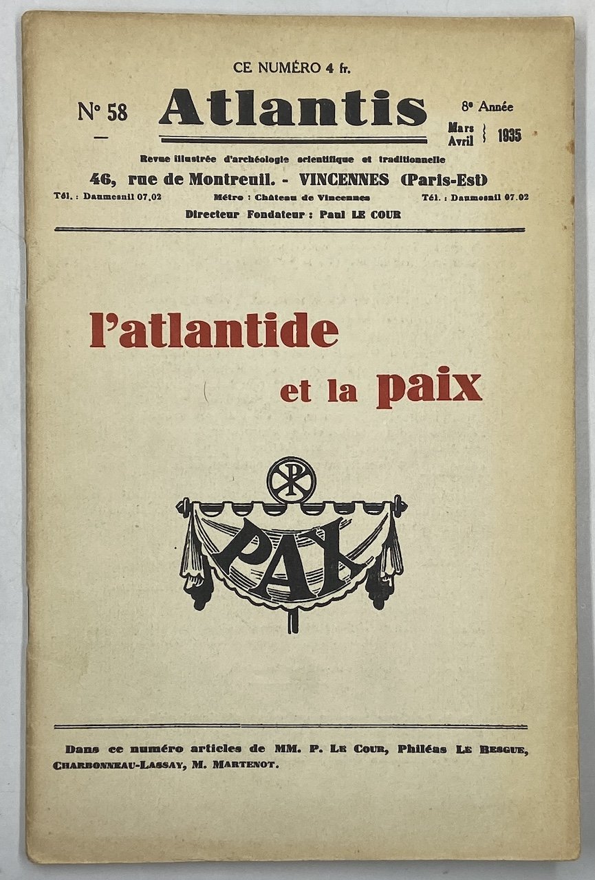 ATLANTIS. Revue illustrée d’archéologie scientifique et traditionnelle. N° 58 Mars Avril 1935. L’ATLANTIDE ET LA PAIX.