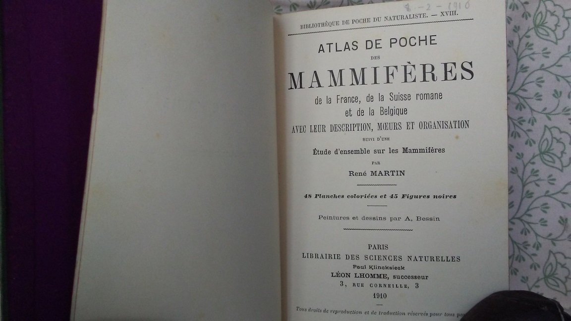 ATLAS DE POCHE DES MAMMIFERES de la France, de la Suisse romane et de la Belgique. Avec leur Description, Moeurs et Organisation. Suivi dune Etude densemble sur les Mammifres. 48 Planches colories et 45 Figures noires. Peintures et dessins par A. Bessin