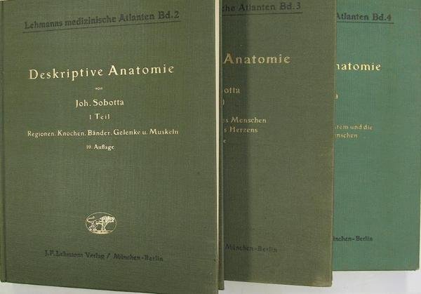 Münich, Berlin, Lehmanns Verlag, 1938-39. 3 volumes in/4 carrés, reliures pleine toile verte sous étuis cartonnés, vol .1(squelette, articulations, myologie) : 180 figures en couleurs, 183 en noir, 321 p. - vol.2 (région et appareils, organes, coeur) : 110 illustrations couleurs, 100 en noir, 221 p. - vol. 3 (système nerveux, organes des sens, glandes lymphatiques) : 156 illustrations en couleur, 137 en noir, 359 p. Texte en allemand. Bandes adhésive portant le titre traduit en français sur les dos ; ouvrages en excellent état.