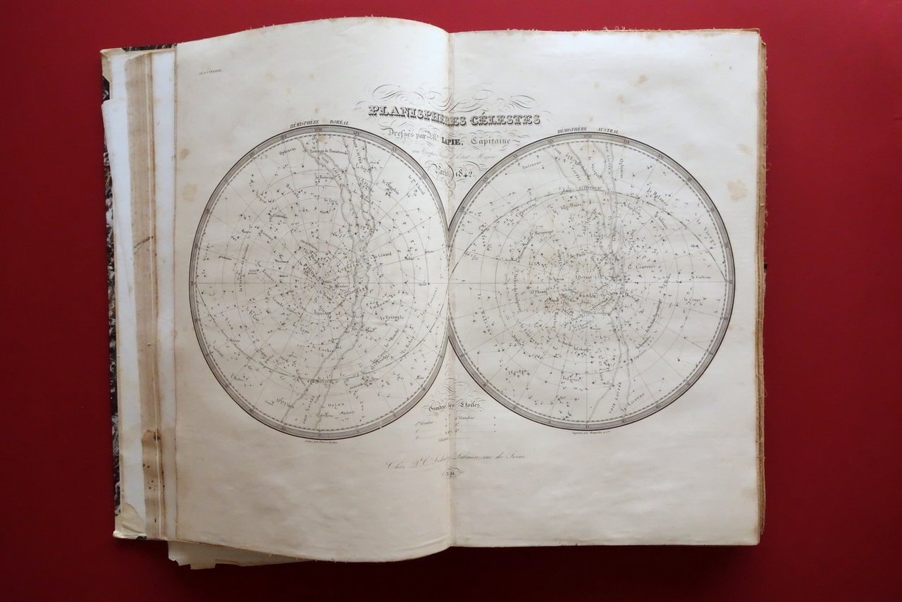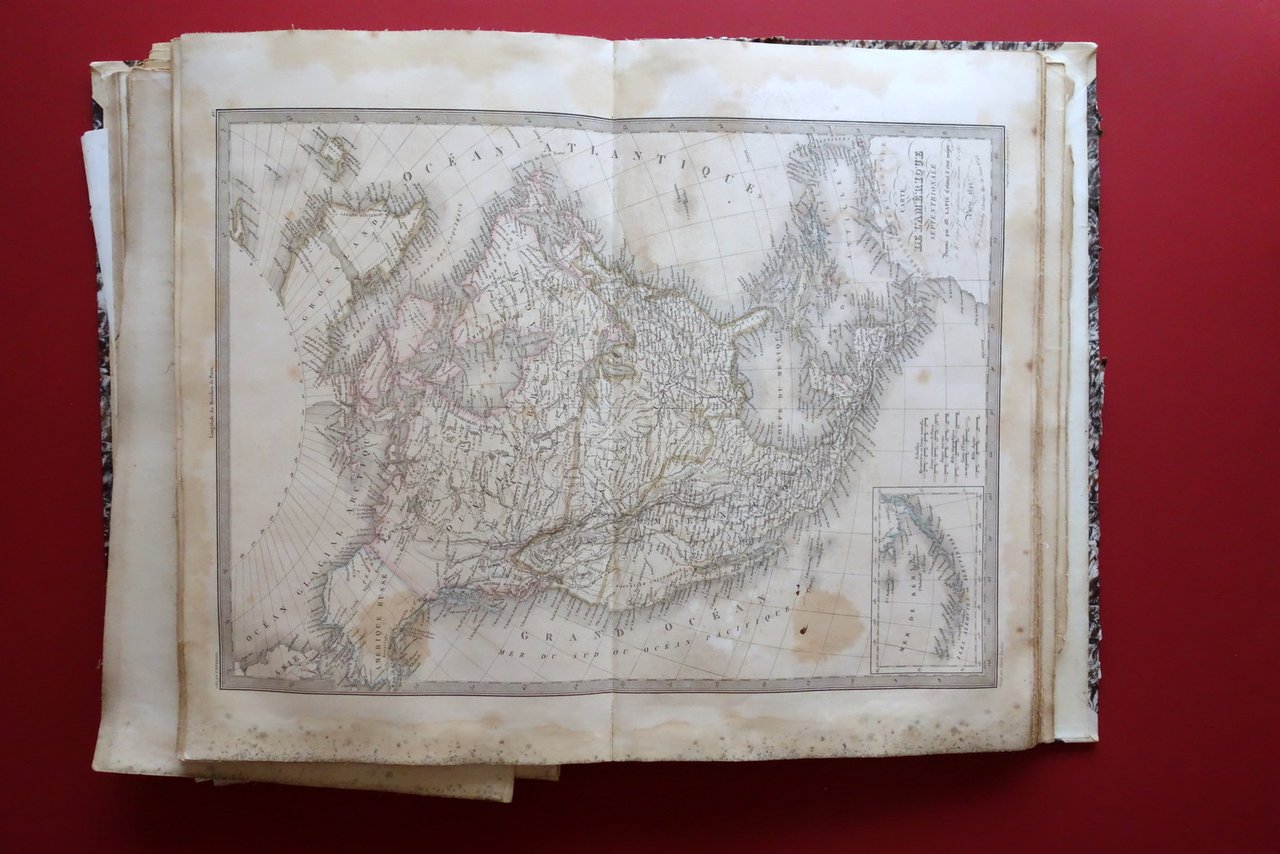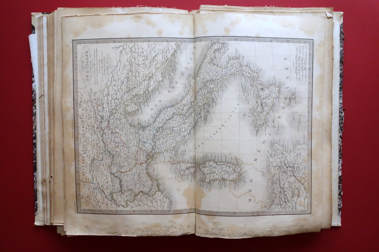 Atlante geografico antico, (M. Lapie), † Atlas Universel de Geographie ancienne et moderne precedË d'un abregÈ de geographie physique et historique par M. Lapie [.] et M. Lapie fils [.] P. C. Lehuby Libraire Editeur, Paris 1841; cm 51x34,5; pp. [4]-98 di testo pi˘ 50 belle grandi carte incise in b/n con confinazioni acquerellate a mano (gravË par Pierre Tardieu - imprimË par Kaeppelin et C.); legatura d'epoca in mezza pelle con titolo e fregi impressi in oro al dorso con nervature, piatti marmorizzati. Atlante completo di tutte le 50 carte. † Condizioni di conservazione Condizioni pi˘ che discrete con tracce d'uso, piatti con marginali mancanze e strappetti al rivestimento marmorizzato; dorso con spellature, cerniere con alcune mancanze e fessurazioni, parzialmente oggetto di restauro artigianale mediante collante (vedi foto); leggera macchia al piatto anteriore. Interni con foxing diffuso ma per lo pi˘ di leggera entit‡, fessurazione e conseguente distacco delle carte 22-23-24-25-26-27-28-29-30; margine inferiore delle pagine con leggera gora e alcune tracce di vecchia umidit‡ che non pregiudicano o che non coinvolgono le carte (vedi foto). Risguardi, frontespizio e indice con tracce di pieghe. † Bell'atlante ottocentesco, completo di tutte le 50 grandi carte finemente incise (vedi foto indice). Raro da reperirsi completo. Edizione francese. Condizioni come da foto e descrizione. † SETT229.L24923 N
