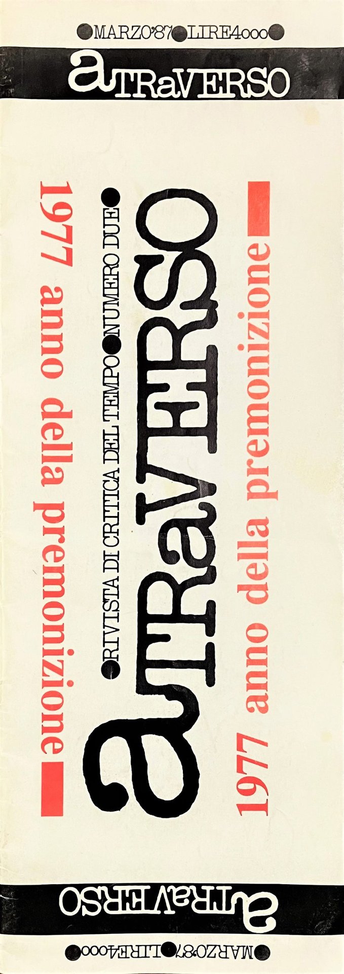 Legatura con punti metallici, numerose illustrazioni in b/n nel testo, seconda serie del più emblematico foglio trasversale degli anni '70, il formato cambia, scompare la barra derridiana di "A/traverso", il titolo, "L'anno della premonizione", pare dedicato non tanto a una rivisitazione storica del passato, quanto "alla riscoperta del messaggio lungimirante" del '77: la questione della Tecnica che cessa di esser strumento e diventa dimensione totalizzante, costruendo un mondo mostruoso senza futuro. Articoli di Franco Berardi, Franco Lattanzi, Pino De March, Carlo Formenti, Christian Marazzi, Oreste Scalzone, Enzo Modugno, Maurizio lambertini, Valentina Merz, Piero Lo Sardo, Bruno Giorgini, Beppe Ramina, Corda Serra, Franco Bolelli. Minimi segni d'uso alla brossura.