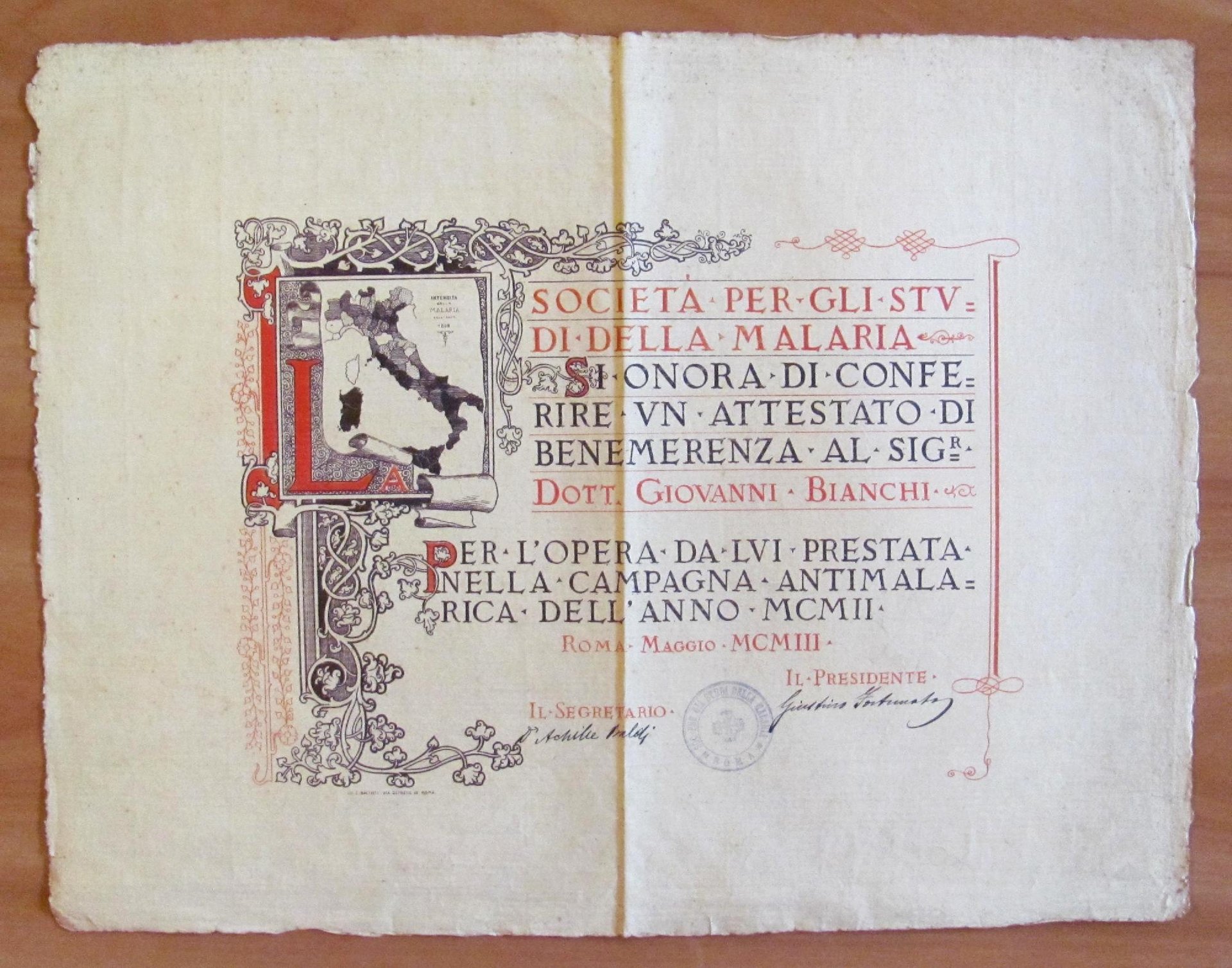ATTESTATO DI BENEMERENZA CAMPAGNA ANTIMALARICA del 1903 - Lit. BATTISTI - RARO