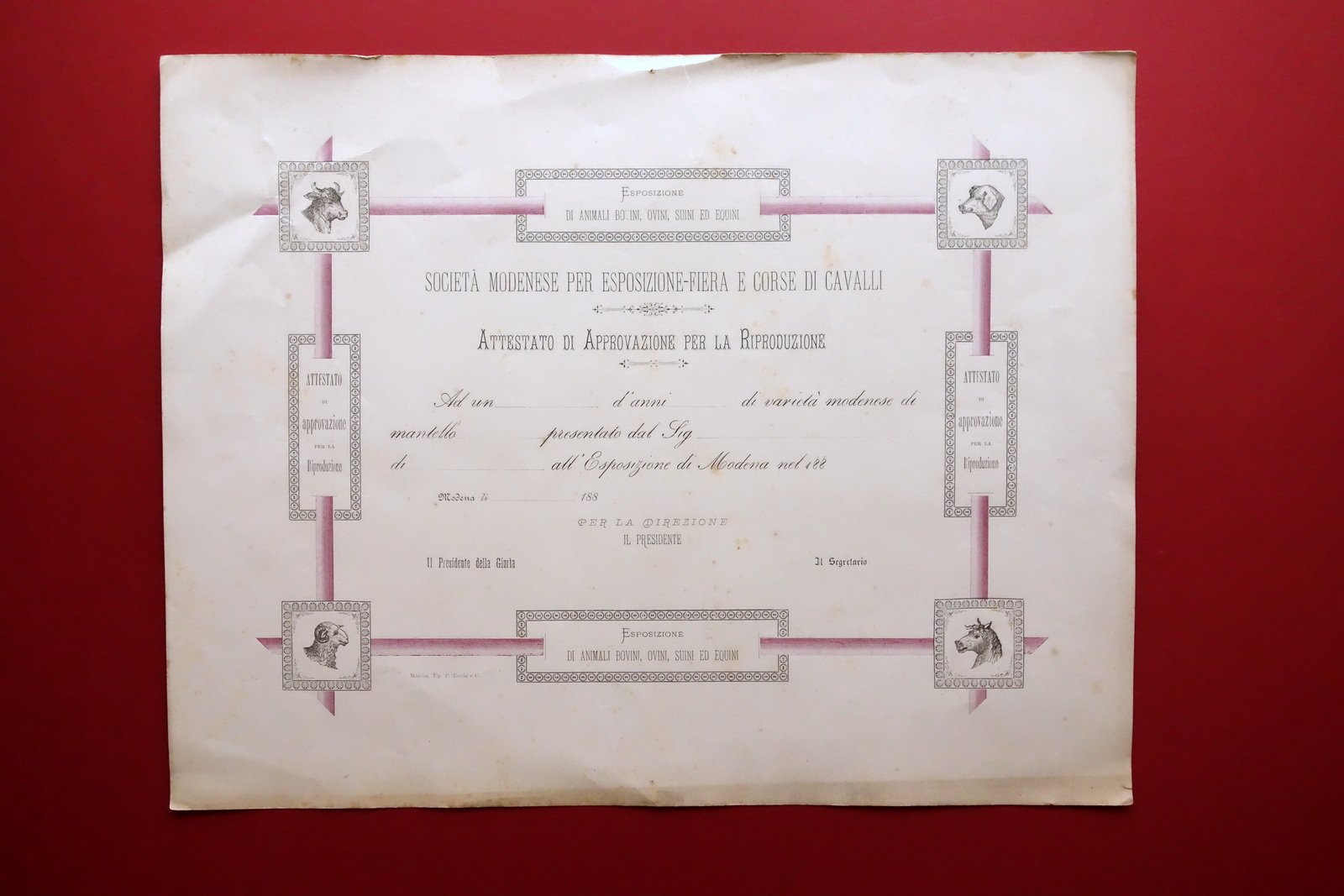 Attestato, Esposizione di animali bovini, ovini, suini ed equini - Società Modenese per Esposizione - Fiera e Corse di Cavalli Attestato di Approvazione per la Riproduzione Modena, anni '80 dell'Ottocento Tip. Toschi e C., Modena, s. d. ma anni '80 dell'Ottocento; attestato a stampa su cartoncino, con testo riquadrato entro cornice con, agli angoli, ill. in b/n di animali; non compilato. Cm 39x50. Condizioni di conservazione: Buone condizioni con alcune piccole / minime leggere bruniture, angolo superiore sinistro con leggera traccia di piega, parte superiore con un paio di strappetti di cui uno restaurato al retro con nastro per riparazioni cartacee. Per maggiori dettagli vedi foto. Non compilato. EXTRA.0390 N