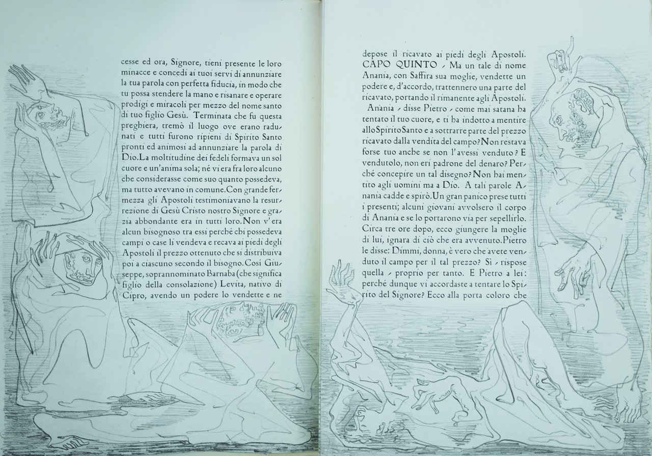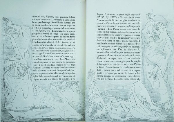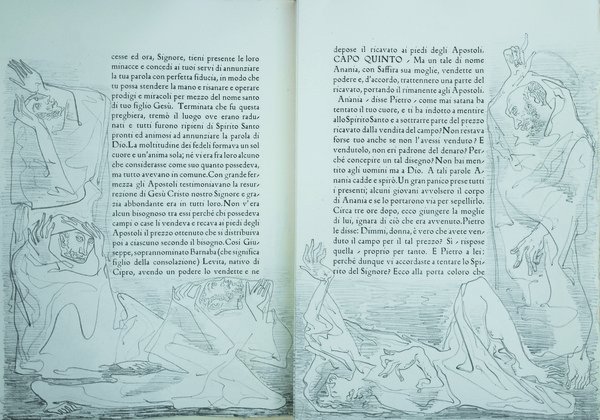 In-4, brossura orig. figurata, 77 cc.nn. (a fogli sciolti), contenute in scatola di cartone mod. con titolo oro su tassello. L'opera di San Luca, annotata da Pietro de Ambroggi, è iillustrata ai margini del testo da complessive 60 composizioni di Nino Strada. Bella ediz. d'arte di 183 esemplare numerati, su carta filigranata con il segno della Conchiglia. Il ns., n. 96, fa parte della tiratura di 122. Ben conservato.