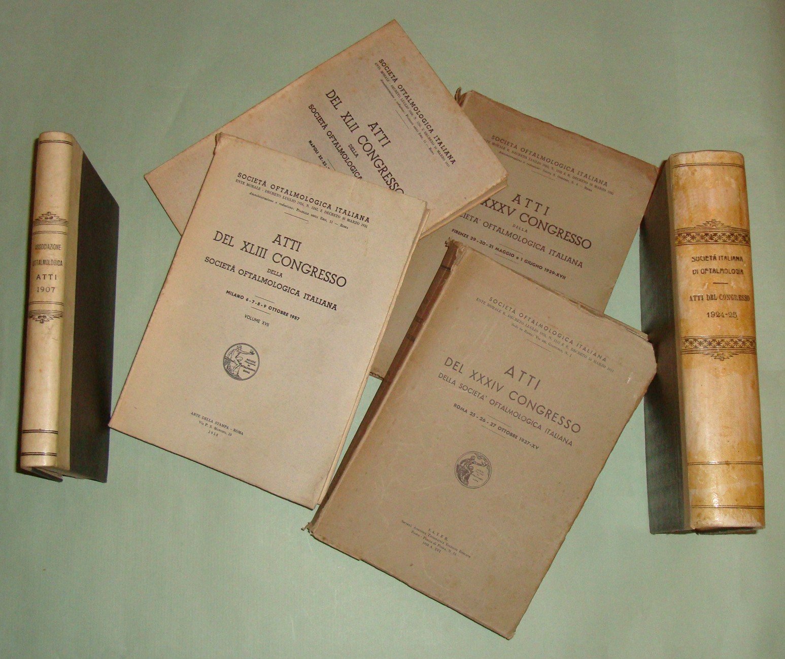 Atti del Congresso di Oftalmologia. Varie annate. 1902-1958. Memorie del XVI Congresso dell'Associazione Oftalmologica Italiana tenuto in Firenze dal 12 al 16 Ottobre 1902. Pavia, 1903. In 8vo; pp.552. Illustrazioni. Mezza pergamena con angoli, titolo e ricchi fregi in nero al dorso. Unito: Rendiconto Riassuntivo per cura del Comitato Ordinatore. Associazione Ottalmologica Italiana XVII Congresso Napoli 10-14 ottobre 1905. Pavia, Bizzoni, 1905. In 8vo; pp.286. In fine due tavole. Mezza pergamena, titolo in nero al dorso. Unito: Unito: Atti del Congresso. Associazione Ottalmologica Italiana. XIX Riunione. Parma,1-4 ottobre 1907. Pavia, Bizzoni, 1907. In 8vo; pp.442. In fine sette tavole, di cui una più volte spieghevole. Mezza pergamena, titolo in nero al dorso. Unito: Atti del Congresso 1924 e 1925. Società di Oftalmologia. Roma, Tipografia delle Scienze, 1925-1926. Due parti in un volume in folio; pp.378; 383. Tavole a piena pagina a colori ed in bianco e nero. Illustrazioni intercalate nel testo. Mezza pergamena, titolo in nero al dorso. Unito: Congresso Oculistico di Napoli, s.d. Parte I e II. In 8vo; pp. 540. Illustrazioni. Mezza pergamena, titolo in nero al dorso. Unito: Atti del XXXIV Congresso della Società Oftalmologica Italiana. Roma, Ottobre 1937. Roma, 1938. In 8vo; pp.734. Illustrazioni a colori ed in bianco e nero. Bross. edit. Unito: Unito: Atti del XXXV Congresso della Società Oftalmologica Italiana. Firenze, Maggio Giugno 1939. Roma, 1939. In 8vo; pp.609. Illustrazioni a colori ed in bianco e nero. Esemplare a fogli chiusi. Bross. edit. Unito: Atti del XLII Congresso della Società Oftalmologica Italiana. Napoli, 1956. Roma, 1957. In 8vo; pp.492. Illustrazioni. Esemplare a fogli chiusi. Bross. edit. Unito: Atti del XLIII Congresso della Società Oftalmologica Italiana. Milano, 1957. Roma, 1958. In 8vo; pp.748. Illustrazioni. Esemplare a fogli chiusi. Bross. edit.