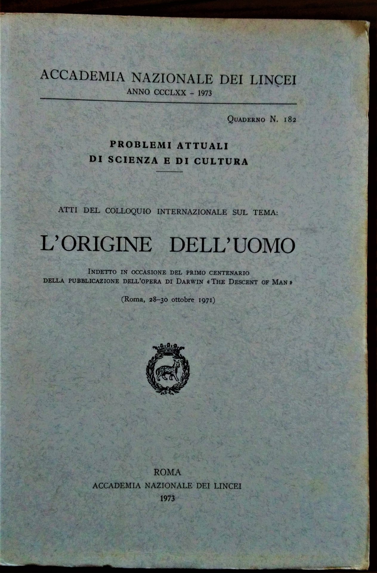Atti del Convegno Internazionale sul Tema: L' Origine dell' Uomo. Indetto in occasione del primo centenario della pubblicazione dell' opera di Darwin " The Descent of Man ". ( Roma, 28-30 ottobre 1971 ).