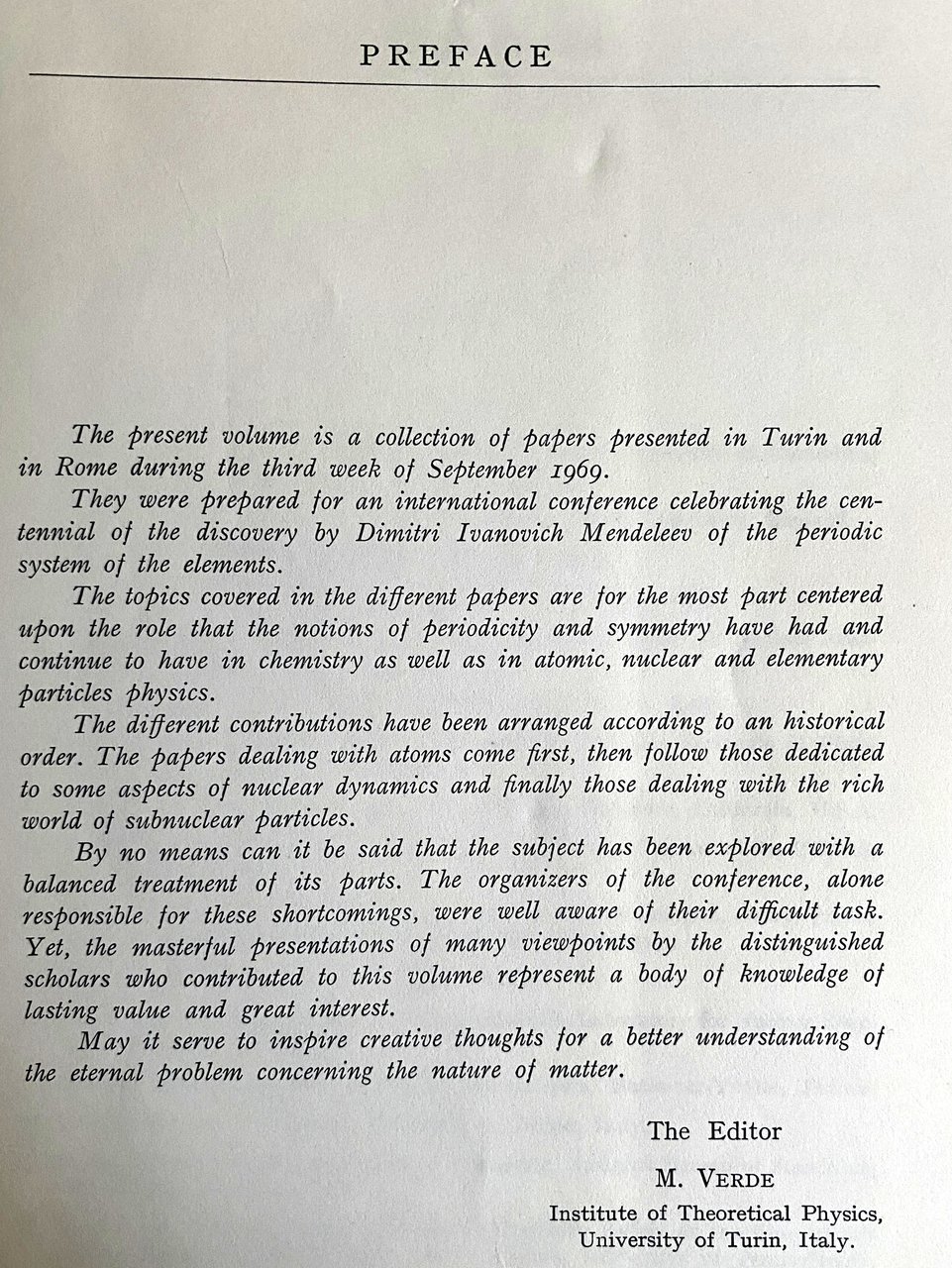 Titolo originale: Transactions of the Mendeleev Conference. Periodicity and Symmetry in Elementary Structure of Matter. Turin-Rome, 15-21 September 1969