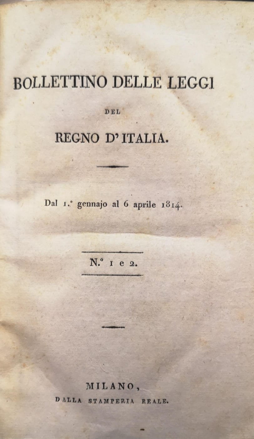 In-16 gr. (mm. 199x125), mezza pelle coeva, titolo e fregi oro al dorso, pp. IV, 193. Disponiamo delle parti I e II, dal 1° gennaio al 6 aprile 1814.