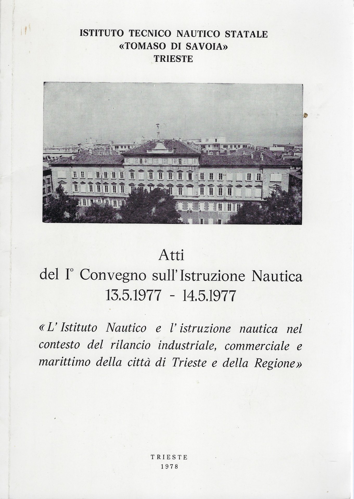 Atti del 1° Convegno sull'Istruzione Nautica 13.5.1977 - 14.5.1977. "L'Istituto Nautico e l'istruzione nautica nel contesto del rilancio industriale, commerciale e marittimo della città di Trieste e della Regione".