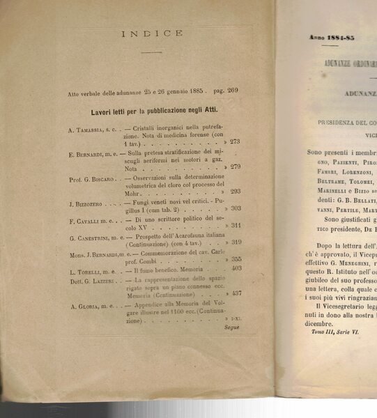 Tavole disegnate b.n. f.t. Indice:Tamassia A. - Cristalli inorganici nella putrefazione, nota di medicina forense. Bernardi E. - Sulla pretesa stratificazione dei miscugli aeriformi nei motori a gaz, nota. Biscaro G. - Osservazioni sulla determinazione volumetrica del cloro col processo del Mohr. Bizzozero J. - Fungi veneti novi vel critici, Pugillus I. Cavalli F. - Di uno scrittore politico del secolo XV. Canestrini G. - Prospetto dell'acarofauna italiana (continuazione). Bernardi J. - Commemorazione del Cav. Carlo prof. Combi. Torelli L. - Il fumo benefico, memoria. Lazzeri G. - La rappresentazione dello spazio rigato sopra un piano connesso ecc. memoria (continuazione). Gloria A. - Appendice alla memoria del Volgare illustre nel 1100 ecc. (continuazione)