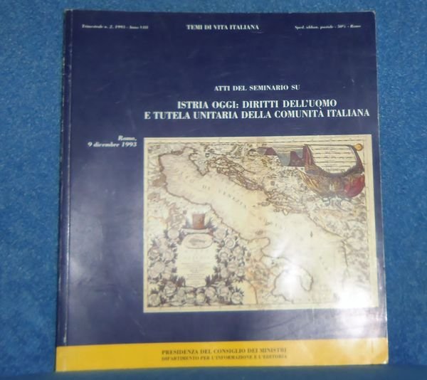 [Istria Storia](cm. 23.7 x 21.5) Brossura editoriale figurata, -pp. 134. Con mappe e fotografie nel testo, anche a colori. Con le relazioni e gli interventi del seminario tenutosi in Roma 1993 presso la Camera dei deputati. Temi di vita italiana Trimestrale 2 anno VIII. Ordinari segni d'uso alla brossura, peraltro buon esempare. [n22]