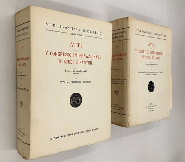 Opera completa in 2 spessi monumentali volumi in-8° gr. (cm. 25x18,3), ,brossura editoriale, pp. VIII,740; pp. VIII,618; con complessive 155 TAVOLE (numerate 143 +12) in bianco e nero fuori testo e diverse FIGURE o carte nel testo. Gli atti del V Congresso sono contenuti nei voll. V e VI degli "Studi Bizantini e Neoellenici" e sono sono dedicati a: Storia - Filologia - Diritto (95 saggi di cui 35 di FILOLOGIA) - Archeologia e Storia dellArte - Liturgia e Musica (75 saggi di cui 6 sulla musica gregosriana e greco-bizantina)- Cronaca del congresso. Tra cui gite in Campania, calabria, Sicilia, Pugkie, Grottaferrata, Subiaco). Testi in VARIE LINGUE.