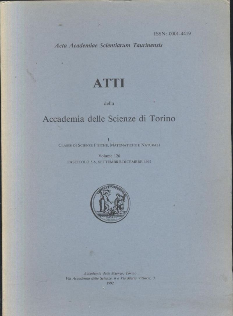 ATTI DELL'ACCADEMIA DELLE SCIENZE DI TORINO volume 126 settembre dicembre 1992. Accademia delle scienze Torino, 1992.