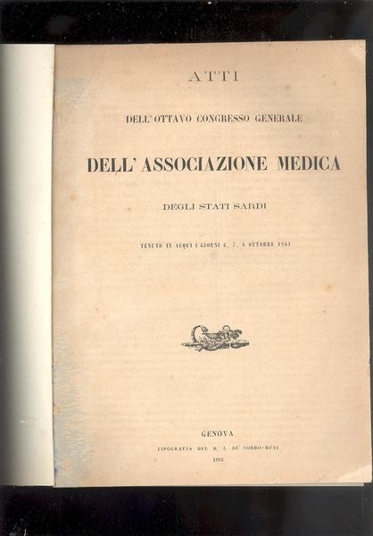 IN 8° gr,( cm.26 X 19 ),pp.22, COPERTINA IN BROSSURA MUTA MODERNA. SONO GLI ATTI DELL' 8° CONGRESSO DELL'ASSOCIAZIONE MEDICA DEGLI STATI SARDI, TENUTO IN ACQUI I GIORNI 6 - 7 - 8 OTTOBRE 1861. L'ASSOCIAZIONE MEDICA DEGLI STATI SARDI, FU FONDATA NEL 1850 DA PACCHIOTTI GIACINTO ( 1820 - 1893 ), MEDICO ALL'UNIVERSITA' DI TORINO. TESTO SU DUE COLONNE. OTTIMA CONSERVAZIONE. ID 3682