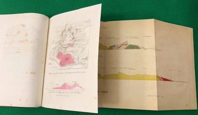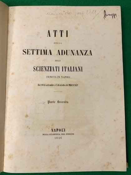 In 4° (30,5 x 22 cm); (3), 1111-1199, (1), CXCIII, (3) pp. e tre c. di tav. fuori testo a colori, una delle quali di notevoli dimensioni. Legatura in mezza-tela novecentesca con titolo impresso in nero al piatto anteriore. Scritta a matita e a penna nel margine alto del frontespizio con scritto copia da pag. 1111/Doppia. In buone condizioni di conservazione. Opera che raccoglie importanti contributi di alcuni dei più importanti scienziati del tempo. Nella seconda parte sono raccolti articoli di Geologia e Mineralogia ed ittiologia. Questa seconda parte di contributi è di notevole importanza in quanto raccoglie studi geologici e mineralogici portati avanti in tutta la penisola verso la metà dell'ottocento. Tali studi sono illustrati da 3 grandi cartine a colori, una con lo spaccato trasversale dell'Appennino da Massa di Carrara a Modena, una con la Carte geologica della Solfatara di Pozzuoli fatta da A. Sacchi nel 1839 (con anche il taglio ideale della Solfatara) e una Carta geologica dei Crateri di Campana di Gigliano e degli Astoni fatta da A. Sacchinel 1839. Interessante anche la parte dedicata all'ittiologia che presenta la prima edizione della celebre classificazione "Catalogo Metodico dei Pesci Europei" di Carlo L. Principe Bonaparte. Una nota posta in fine al primo volume, comunicava al lettore che la seconda parte dell'opera sarebbe uscita subito dopo la pubblicazione della prima: "La ritardanza con la quale ci sono state trasmesse alcune fra le scritture da porsi a stampa, ne à indotti a dividere in due parti gli Atti del VII Congresso, per non indugiarne la pubblicazione; anche avuto rispetto alla grandezza del presente volume. Daremo nella seconda parte, che subito verrà messa alla luce: I lavori della Sezione di Geologia, e Mineralogia; Il Catalogo metodico de' Pesci europei del chiarissimo signor Carlo L. Principe Bonaparte; La serie de' libri offerti o inviati in dono; L'elenco delle persone intervenute al Congresso; L'indice delle Adunanze delle Sezioni; I nomi degli autori citati e la Tavola generale delle cose di cui si ragiona". Opera non comune.