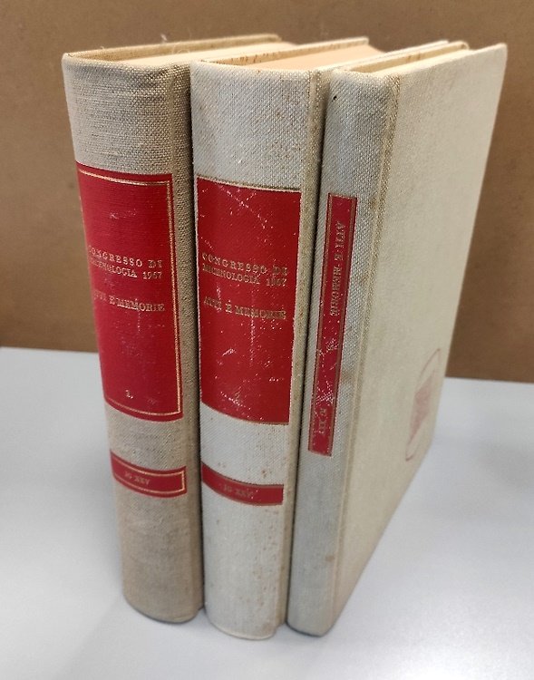 Roma,27/9-3/10/1967. Pubblicazione dell'Ist.di Studi Micenei ed Egeo-Anatolici. Roma, Ediz.dell'Ateneo 1968, 3 voll. cm.19x27, pp.XXXIV-1288, ca.100 tavv.bn.ft. legature editoriali in tutta tela,scritte in oro ai dorsi. Coll.Incunabula Graeca,XXV,1,2,3. STATO: USATO, MOLTO BUONO.