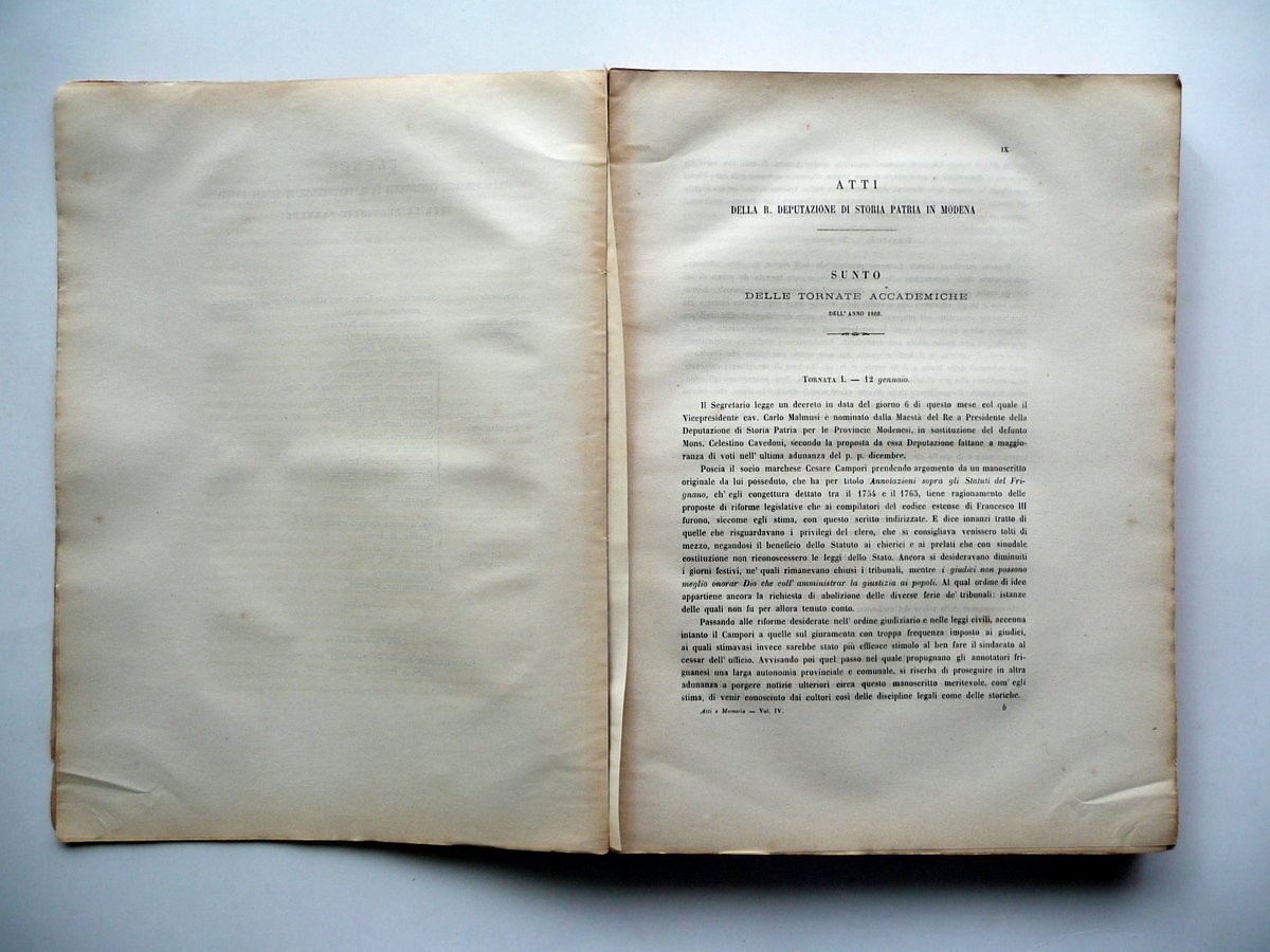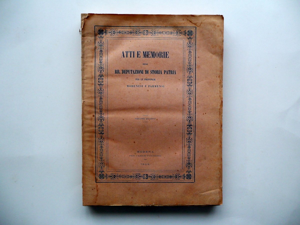 AA. VV., Atti e Memorie delle RR. Deputazioni di Storia Patria per le provincie Modenesi e Parmensi Volume quarto Per Carlo Vincenzi, Modena 1868, cm 33x24, pp. I-XLIV; pp. 1-408; brossura ed. Volume completo. Condizioni di conservazione Esemplare complessivamente ben conservato con tracce del tempo; alcune piccole leggere bruniture; margini delle brossure con pochi minimi strappetti e qualche lieve ombra di gora di vecchia umidità che interessano leggermente anche i margini e gli angoli di alcune pagine, senza mai compromettere il testo; dorso con qualche leggera fessurazione e una piccola mancanza, esemplare complessivamente compatto; brossura ant. in larga parte staccata dal corpo del testo. Interni ancora intonsi. Interni ancora intonsi. Per un elenco completo degli argomenti qui trattati vedi foto indice. SETT95.L8856 N