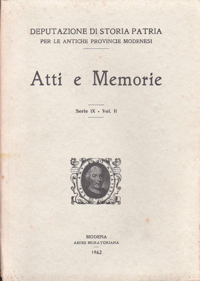 In-8°, pp. 298, (6), copertina editoriale con normali segni d'uso e del tempo: in particolare, qualche piccola, leggera traccia d'umido e una piccola abrasione nella parte inferiore del dorso, con perdita di alcune lettere del titolo, ben reintegrate a matita. Con 13 tavole fuori testo di illustrazioni in bianco e nero. Nell'angolo inferiore destro delle tavole, piccolissima abrasione dovuta alla rimozione di un'aderenza provocata dall'azione dell'umidità sulla carta lucida su cui sono impresse. Piccoli, leggeri segni d'umido ai tagli e al frontespizio. Leggero alone d'umido nel bordo esterno delle pagine 46-51, che interessa marginalmente il testo alle pagine 47-48. Per il resto, ben conservato. Indice: Dedica del volume. Atti. Cariche sociali; Soci; Calendario delle Adunanze; Parole del Presidente Tommaso Sorbelli inaugurandosi l'Anno Accademico 1961-1962; Relazione del Segretario Generale sull'attività svolta dalla Deputazione di Storia Patria per le antiche Provincie Modenesi; Mario Vezzani, In memoria del Rag. Luigi Camparini; Riccardo Finzi, Ricordo di Cesare Iori; Alfonso Morselli, Ricordo di Giovanni Maioli. Memorie. Tiziano Ascari, Commemorazione di Andrea Marchesi detto il Formigine nel quarto centenario della morte; Mario Bertolani, Ritrovamenti di manufatti preistorici al Monte Cimone; Aroldo Bortoli Gilli, Dell'immissione del Panaro nel canale Naviglio a Bomporto; Lidia Bertolini, Considerazioni sulla Beatrice di Dante secondo la interpretazione di Leone Tondelli; Pericle di Pietro, Le disposizioni igieniche nella legislazione modenese del XIV secolo; Carlo Lindner, La riforma del Monastero di Santa Chiara in Reggio Emilia da S. Ignazio a S. Carlo Borromeo; Cesare Giorgi, Il Gen. Carlo Zucchi ed una lettera della Duchessa Maria Beatrice. Muratoriana. Aldo Anreoli, Di alcuni inediti di Benedetto Bacchini; Antonio Bellini, Vicende di sette monache e di una campana; Sergio Bertelli, Erudizione e crisi religiosa nella coscienza europea avanti l'opera muratoriana; Dante Bianchi, Gli annali d'Italia - Principi critici; Giuseppina Crivellaro, Muratori poeta; Pericle di Pietro, L'assistenza agli invalidi nel pensiero muratoriano; Fernando Losavio, Traduzioni da i "Carmina"; Alfonso Morselli, Una data da correggere nella "Vita del Proposto L. A. Muratori"; Marco Cesare Nannini, Francesco II d'Este e L. A. Muratori; Ottavio Parisi, L'Agricoltura al tempo di L. A. Muratori; Laura Pighi, Muratori e i "Trois discours" di Pascal; Paolo Rocca, Ancora una lettera inedita del Muratori dall'Archivio Bentivoglio; Tommaso Sorbelli, Bouhours e Comacchio; Piero G. Nonis, Appunti per un'antropologia Muratoriana.