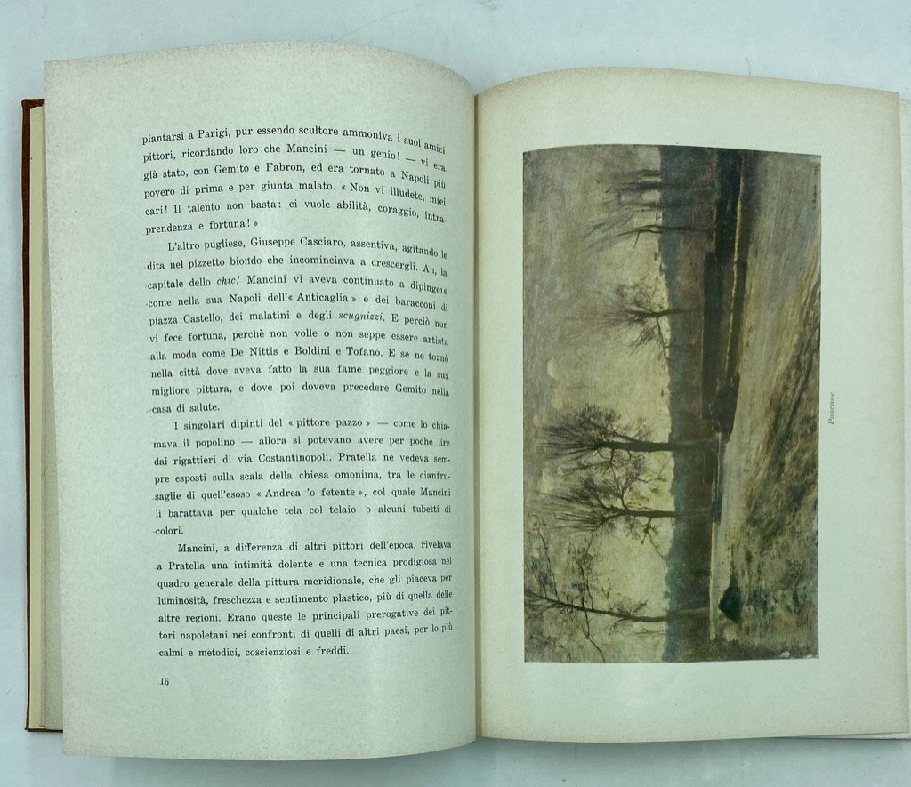 Tela editoriale con sovraccoperta (difetti), cm 25 x 18, pp 81 (3) illustrate in nero + XLV carte di tavole in nero e 3 a colori. Difetti sulla sovraccoperta, internamente molto ben conservato. Monografia dedicata al vedutista napoletano Attilio Pratella (Lugo di Ravenna 1856 - Napoli 1949, illustrata da 54 figure in nero (45 fuori testo) e tre tavole a colori.