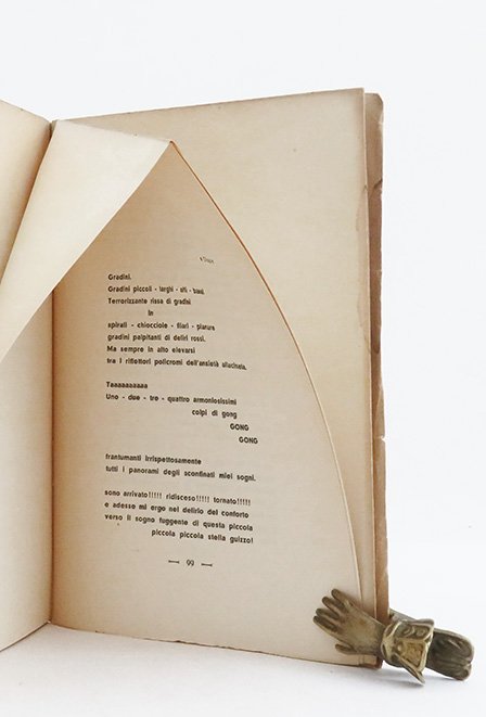 LIBROEdizione originale.CON AUTOGRAFO.Uniforme brunitura, ma non fragile; due leggere gore d’acqua lambiscono i bordi del piatto anteriore; per il resto un ottimo esemplare, integro, a fogli chiusi, pregiato da invio autografo dell’autore (con elegante ex-libris del destinatario).«“Attimi” non era il solito libercolo pseudo modernista spacciato per futurista [.] ma era una cosa davvero strepitosa con poesie ispirate ai padri fondatori (Russolo, Marinetti, Depero) e corroborate da una copertina essenzialista costruttivista di forte impatto» (Echaurren). -- Rarissimo: sole tre attestazioni ICCU (BNC Firenze, Braidense, Apice Milano) e nulla in OCLC né in altri repertori. Interessante raccolta di poesie versolibere moderniste (dedicate alle montagne natali e a tematiche decadentiste), con riuscita piuttosto felice, impreziosita da alcune impennate futuriste: «Fragilità», dedicata a Fortunato Depero («fiori gialli | fiori rossi | fiori verdi | fiori bianchi | [.] Corrono | Corrono | Corrono | nel cielo — all’impazzata | a vicenda | si mangiano | si succhiano | si confondono [.]»); «Al primo pilota interplanetare»; «Io divento una luce» dedicata a Luigi Russolo; «Poema astrale»; «Impressioni di febbre alta», dedicata a Chopin, con autentici momenti di paroliberismo grafico; «La canzone di fremiti e cellule» dedicata «a San Francesco d’Assisi ed a F.T. Marinetti». -- L’autore all’epoca appena ventenne coltivò per alcuni anni la vena creativa, legandosi a Milano al circolo dei futuristi; dopo «Attimi» compone testi per il teatro e lavora con Giannina Censi. La casa editrice «Spem», acronimo di Società palermitana edizioni mediche, è di proprietà della famiglia, originari di Palermo, e oltre a una manciata di saggistica tecnica pubblica le poesie di Francesco e della madre Isabella Montuoro de Luca (La bambola nuda).Echaurren, Futurcollezionismo, pp. 184-6; Cammarota, Futurismo, 331.1; Diz. fut. s.v.