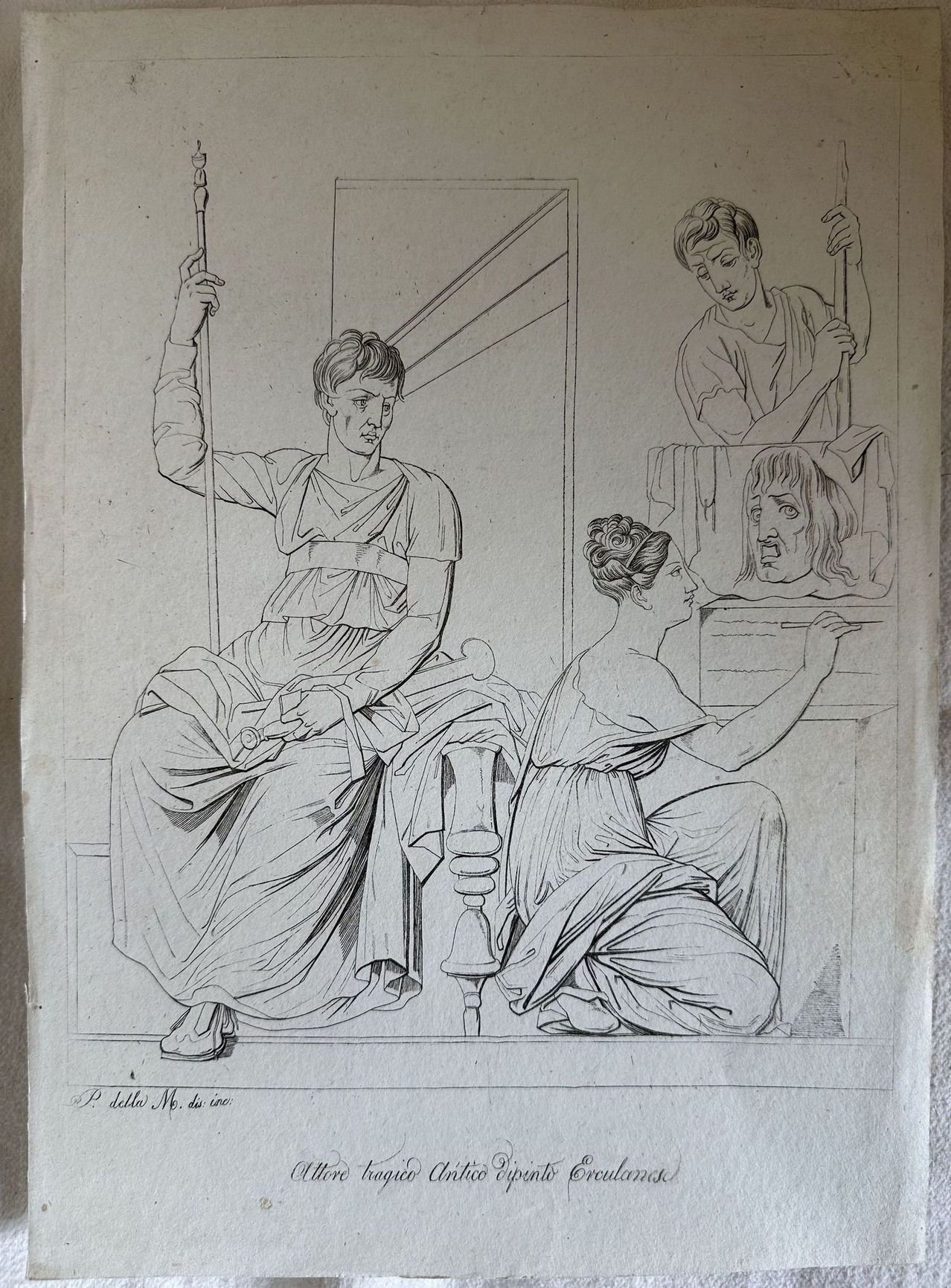 Incisione di un antico dipinto a Ercolano. Autore: B. della M. Data: 1840 circa Tecnica: acquaforte Dimensione del foglio: 32x23 cm Dimensione dell'incisione: 26x2 cm Condizioni: Buone. Alcune fioriture.Engraving of an antique painting in Ercolano Date: 1840 circa Author: B. della M. Technique: etching Size of the page: 32x23 cm Size of the engraving: 26x21 cm Conditions: Good conditions. Some foxing.
