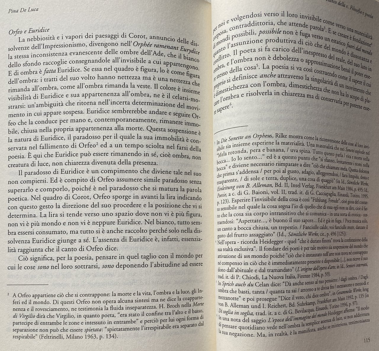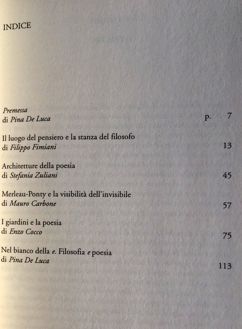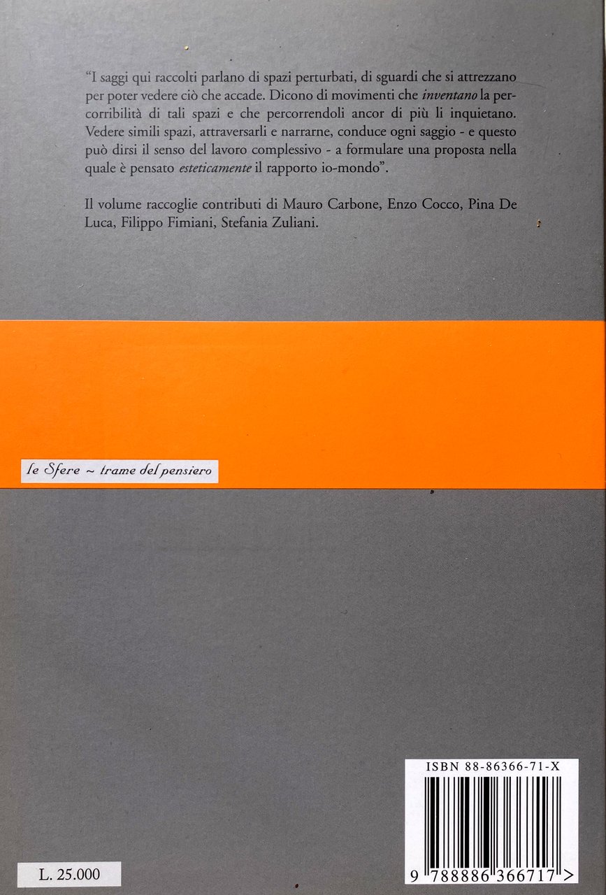 Soggetti: Filosofia, Metafisica, Ontologia, Estetica, Contemporanea, Saggistica, Arts, Philosophy, Modern, 20th century, Collection of 5 essays, Aesthetics, Aufsatzsammlung, Poetik, Pensiero, Italo Calvino, Marozia, Spazio, Letteratura, Poesia, Arte contemporanea, Critica, Saggi critici, Pittura, Scrittura, Arti performative, Architettura, Città invisibili, Invisibilità, Topo, Rondine, Fantasia, Pontiggia, Mario Sironi, Carrà, Campigli, Manifesto, Composizione architettonica, Giardini, Leopardi, Nietzsche, Zibaldone, Rilke, Heidegger, Elegie duinesi, Kant, Szondi, Corot, Orfeo, Euridice, Segal, Bianco, Libri rari fuori catalogo, Bellezza, Delacroix, Baudelaire, Daumier, Edgar Allan Poe, Nottambuli, Hugo, Rousseau, Schlegel, Paesaggio, Hackert, Romanticismo, Naturalismo, Neoclassicismo, Goethe, Hofmannsthal, Ignoto, Paul Klee, Philosophy, Metaphysics, Ontology, Aesthetics, Contemporary, Non-fiction, Thought, Space, Literature, Poetry, Contemporary art, Criticism, Critical essays, Painting, Writing, Performing arts, Architecture, Invisible cities, Invisibility, Fantasy, Architectural composition, Gardens, Duino Elégiés, Orpheus, White, Rare books out of print, Beauty, Nightowls, Landscape, Romanticism, Naturalism, Neoclassicism, Unknown