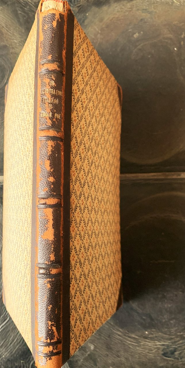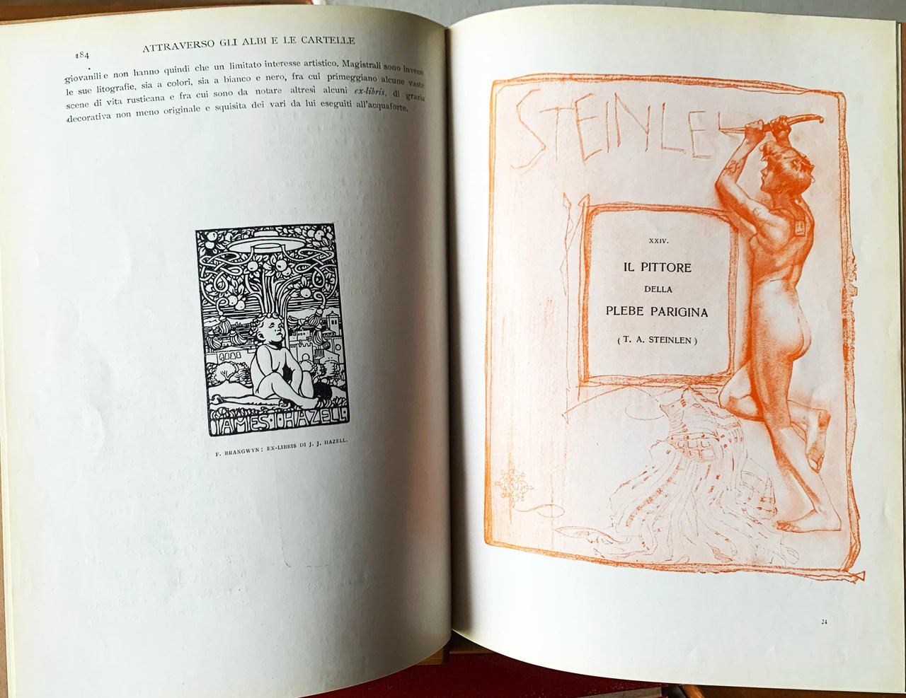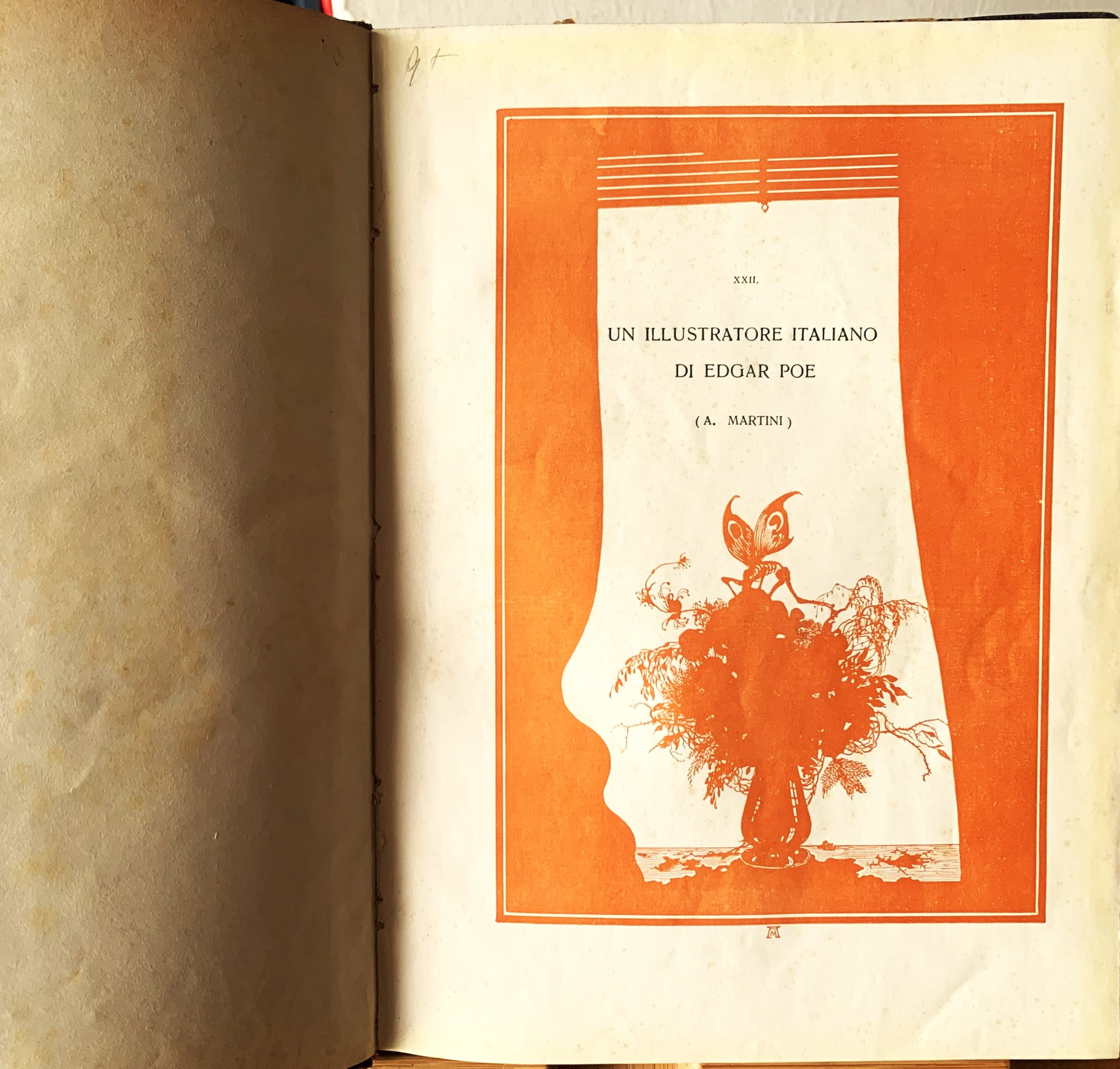 I ed. Raccolta di tre capitoli del fasc. VIII, III Serie dell'opera "Attraverso gli Albi e le Cartelle. Sensazioni d'Arte" di Vittorio Pica (scrittore d'arte italiano, Napoli 1864 - Milano 1930). La raccolta si presenta incompleta, di seguito i capitoli conservati: XXII. Un illustratore italiano di Edgar Poe (A. Martini) - XXIII. Due maestri nordici dell'incisione (A. Zorn - F. Brangwyn) - XXIV. Il pittore della plebe parigina (T. A. Steinlen). In-8, pp. 105-214+(2), rilegatura in mezzapelle con angoli (dorso e angoli in pelle marrone con al dorso nervature e titoli color oro - piatti in cartone ricoperti con carta ornata da motivi floreali geometrici in color rame/blu su fondo avorio). Frontespizi capitoli illustrati in arancione numerose illustrazioni in b/n nel testo e tavole f.t. in cartoncino ruvido colorato con illustrazioni in b/n applicate protette con carta velina. Sguardie con ornato floreale geometrico nei toni del beige. Nel secondo piatto della copertina applicato un ex libris illustrato in marrone. Stato buono-discreto (opera incompleta e mancante di un frontespizio che raggruppa i capitoli - copertina con i margini abrasi e con i piatti ingialliti - pagine e veline protettive ingiallite e con fioriture). Artisti: Alberto Martini, incisore italiano (Alberto Giacomo Spiridione Martini, Oderzo-TV 1876 - Milano 1954) - Anders Zorn, incisore svedese (Anders Leonard Zorn, Mora-S1860 - ivi 1920) - Frank Brangwyn, incisore britannico (Sir Frank William Brangwyn (Bruges-B 1867 - Ditchling-GB 1956) - Théophile Alexandre Steinlen, pittore svizzero/francese (Losanna,-CH1859 - Parigi-F 1923)
