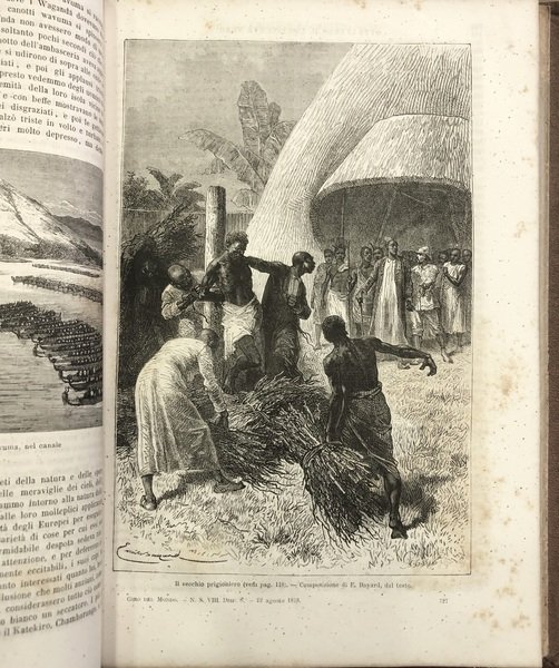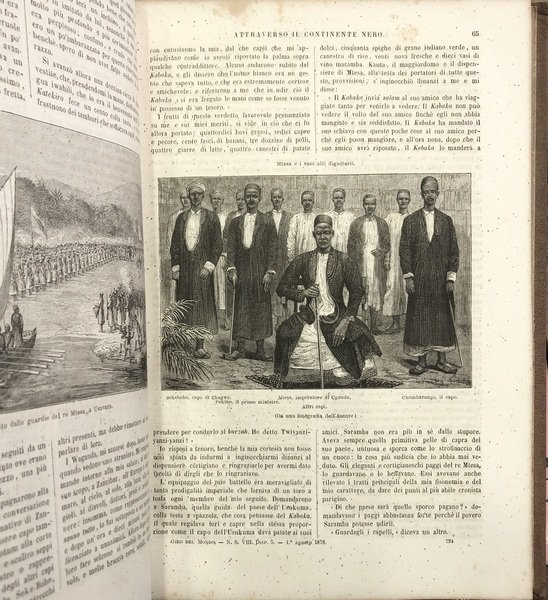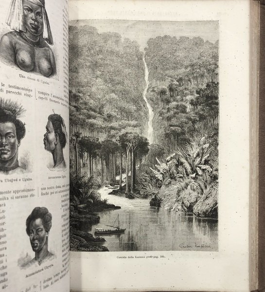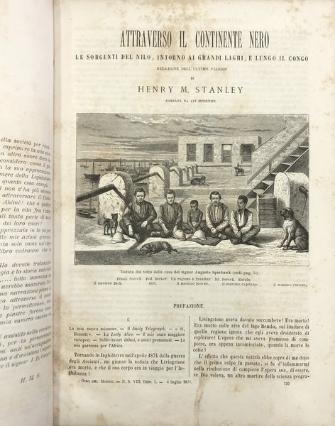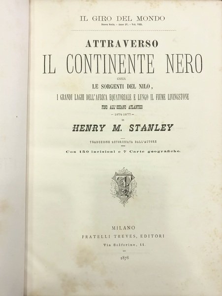 Ossia le Sorgenti del Nilo, i grandi laghi dell'Africa Equatoriale e lungo il fiume Livingstone fino all'Oceano Atlantico, 1874-1877. Collana Il giro del mondo - Nuova Serie, Anno IV, Vol.VIII. Traduzione autorizzata dall'Autore. Treves, Milano, 1878. Bella legatura in mezza pelle con nervi (cm 30x21), titolo e fregi oro al dorso, pp 374, con 150 incisioni in rame, una carta geografica a colori in folio ripiegata allegata al testo. Non sono presenti le 7 carte geografiche che venivano vendute separatamente. Qualche fioritura sulle pagine.