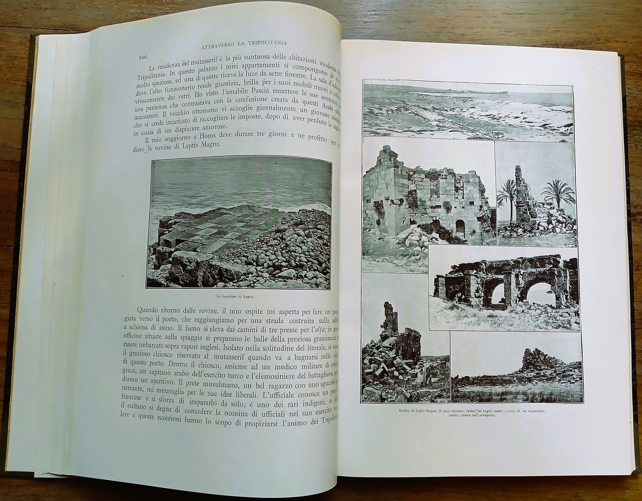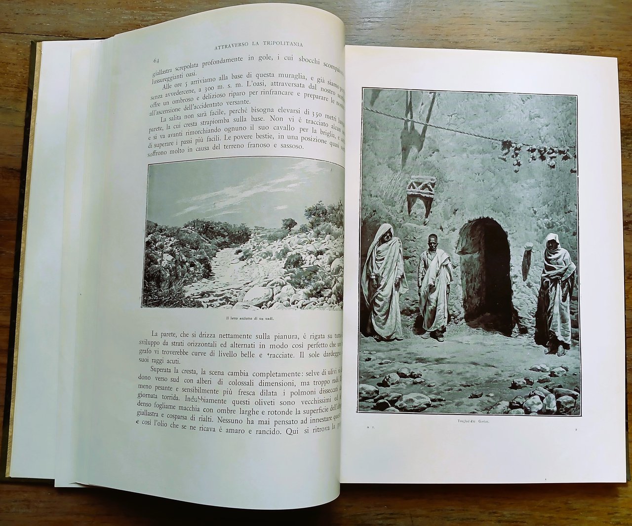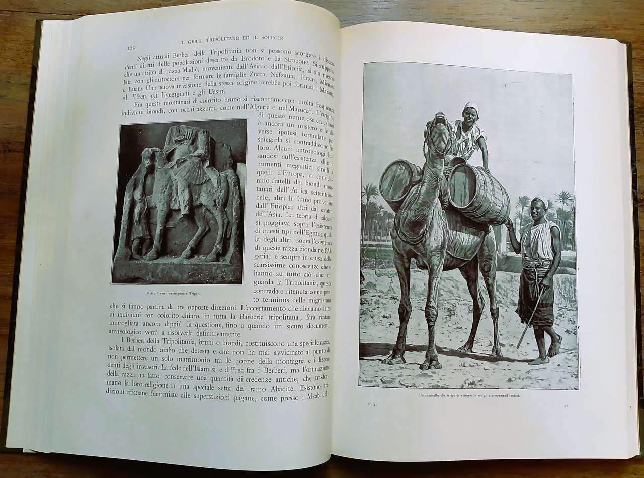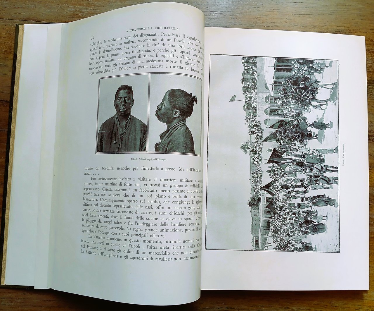 "Traduzione con aggiunte sulla Libia odierna per cura di Luigi Cufino Segretario della Società Africana d'Italia". In 4°, legatura coeva in mezza percallina verde con punte, titoli e filetti impressi in oro al dorso, carta marmorizzata ai piatti, guardie in carta decorata e cerniere in tela, pp. XII,264 su carta patinata con numerose illustrazioni in bianco e nero intercalate nel testo ed a piena pagina. Prima edizione italiana. Una firma di vecchia proprietà a matita viola sullo spazio bianco del frontespizio. Ottimo stato di conservazione.