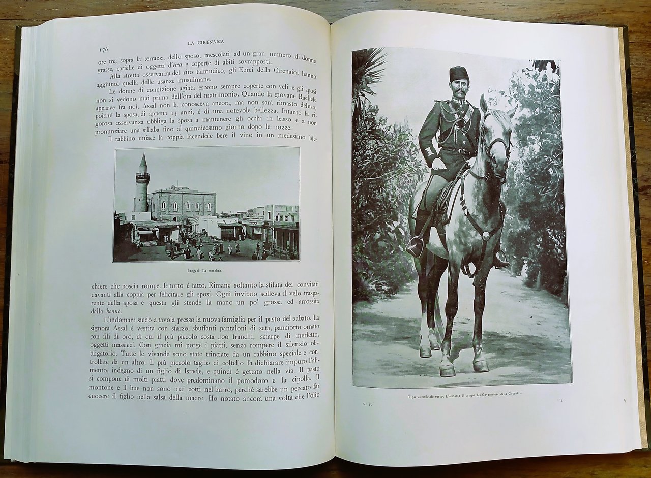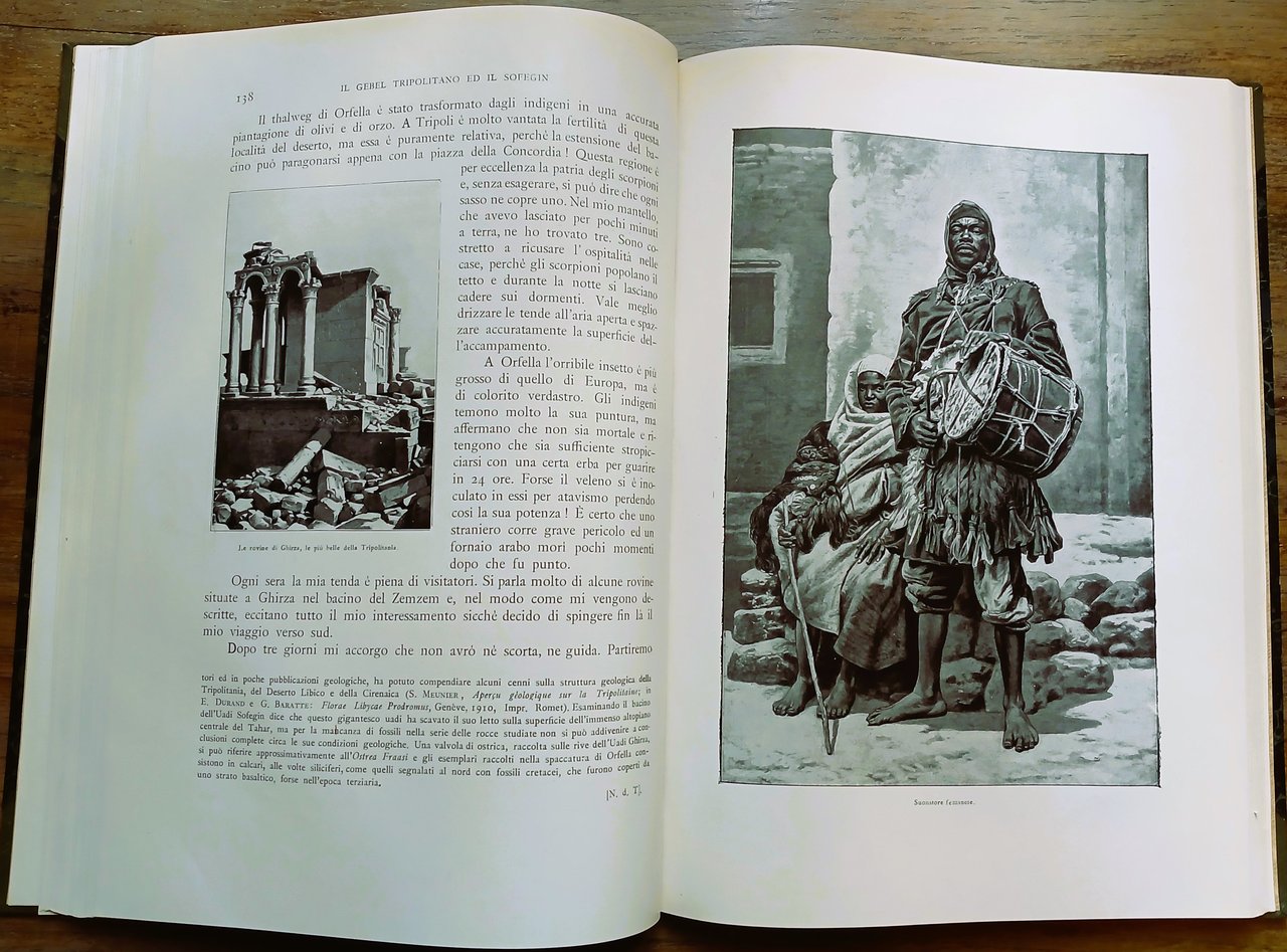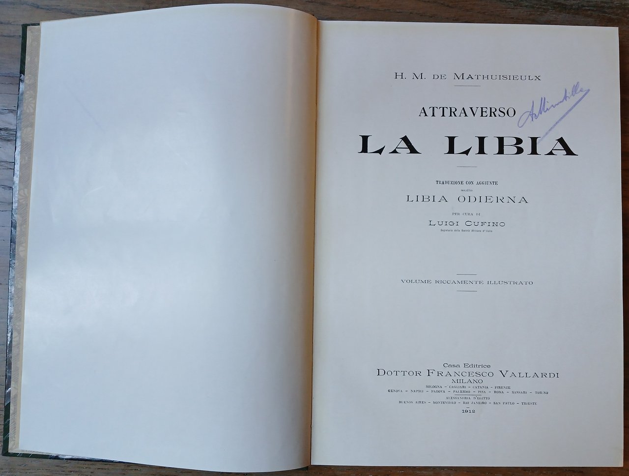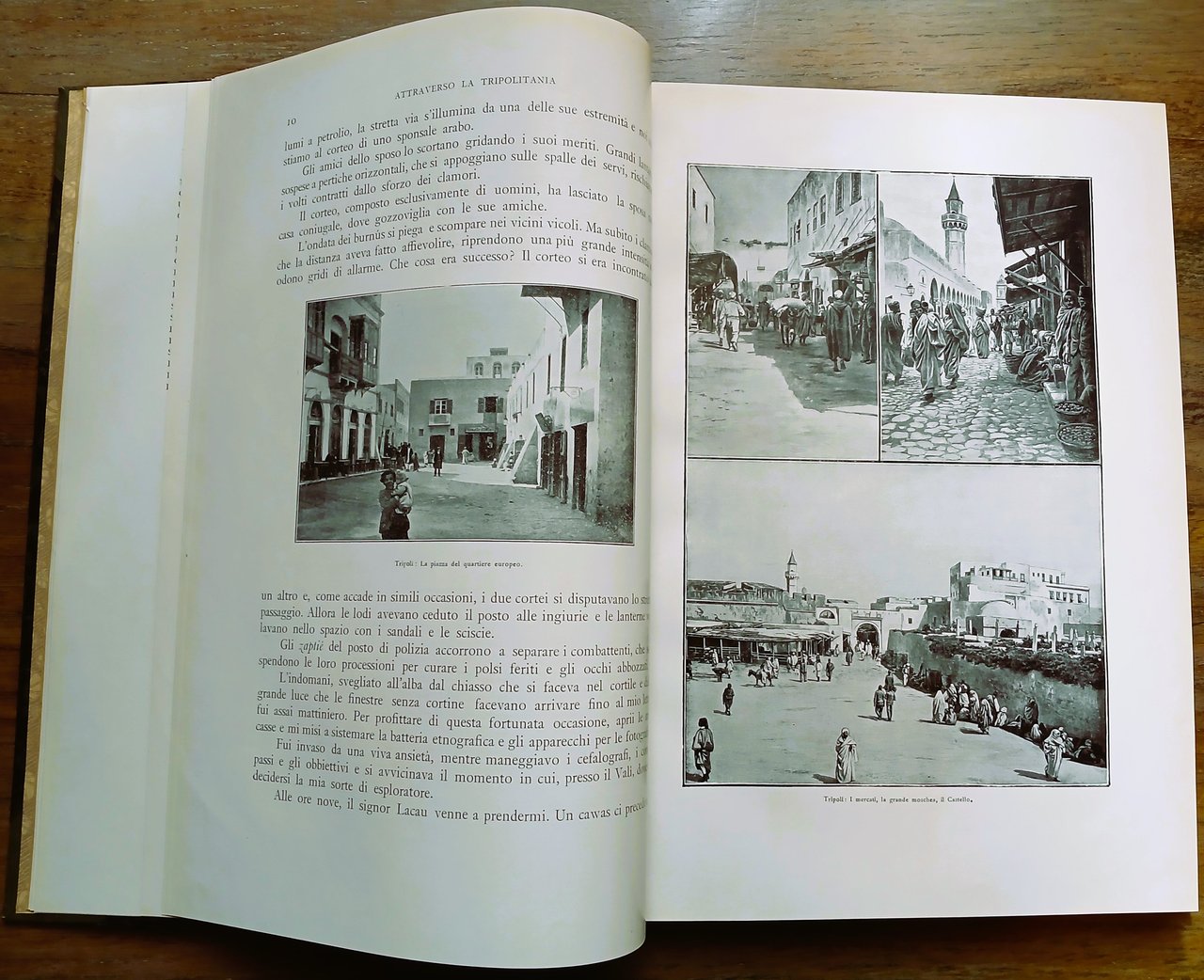 "Traduzione con aggiunte sulla Libia odierna per cura di Luigi Cufino Segretario della Società Africana d'Italia". In 4°, legatura coeva in mezza percallina verde con punte, titoli e filetti impressi in oro al dorso, carta marmorizzata ai piatti, guardie in carta decorata e cerniere in tela, pp. XII,264 su carta patinata con numerose illustrazioni in bianco e nero intercalate nel testo ed a piena pagina. Prima edizione italiana. Una firma di vecchia proprietà a matita viola sullo spazio bianco del frontespizio. Ottimo stato di conservazione.