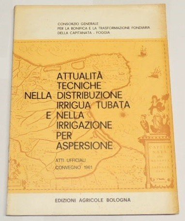 Consorzio generale per la bonifica e la trasformazione fondiaria della Capitanata – Foggia, Attualità tecniche nella distribuzione irrigua tubata e nella irrigazione per aspersione. Atti ufficiali Convegno 1961, Edizioni Agricole, Bologna 1963, pp. XI, 302, ill. b.n., cm 29, br. ed. Segni del tempo e visibili fioriture.
