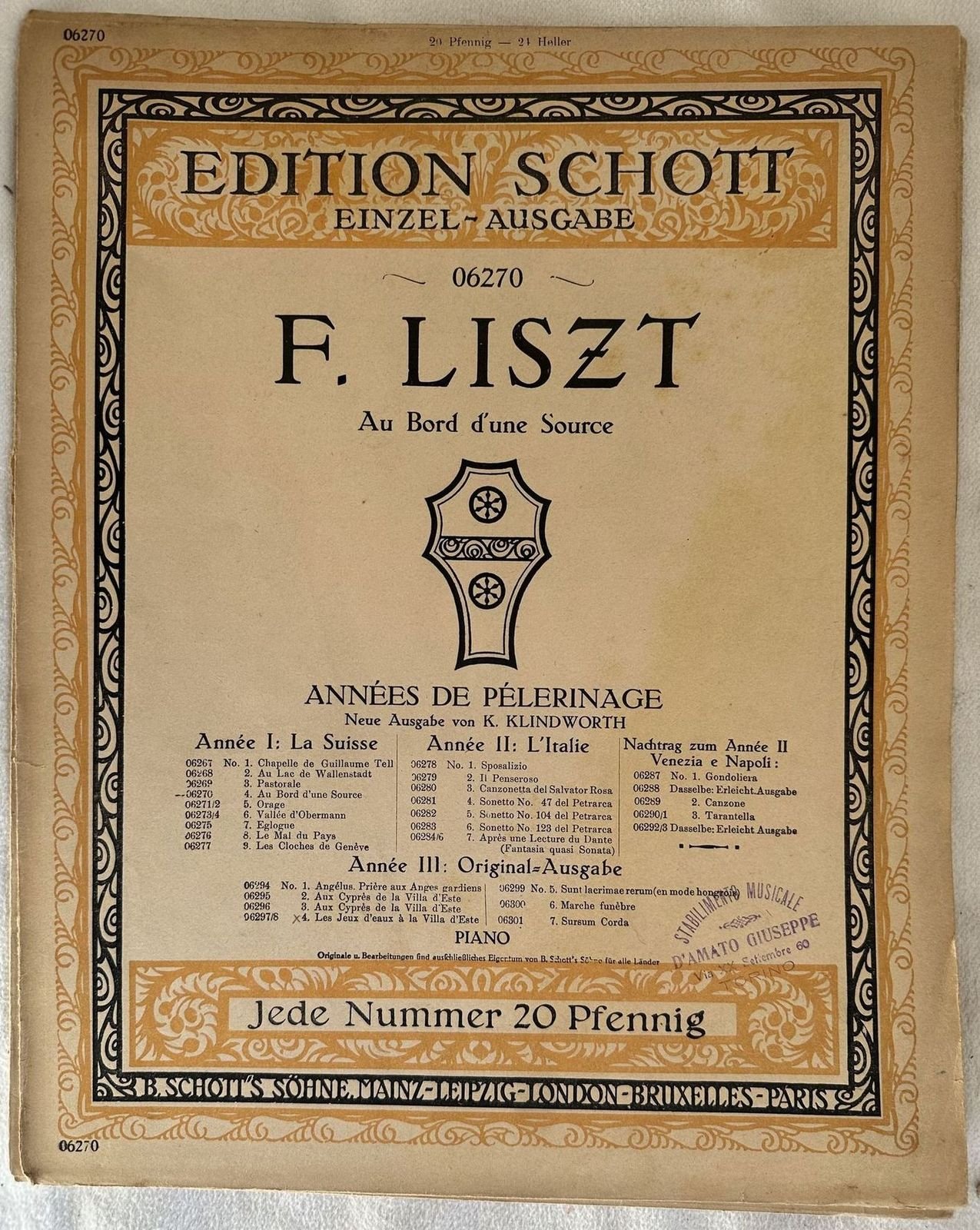 Edizione del 1912 della melodia "Au bord d'une source" di Franz Liszt (1811-1886) dall'opera "Annees de pelerinage". In buone condizioni. Copertina editoriale in buone condizioni con lievi usure marginali. Piatti in parte staccati. Legatura editorialmente assente. Pagine in buone condizioni con rare fioriture. In Folio. cm. 34x27. Pp. 8.Edition of 1912 of the melody "Au bord d'une source" by Franz Liszt (1811-1886) from the opera "Annees de pelerinage". In good conditions. Editorial cover in good conditions lightly worn in the extremities. Plates aprtially detached. Binding editoriarly lacks. Pages in good conditions with occasional foxing. In Folio. cm. 34x27. Pp. 8.