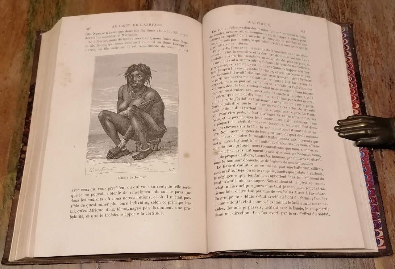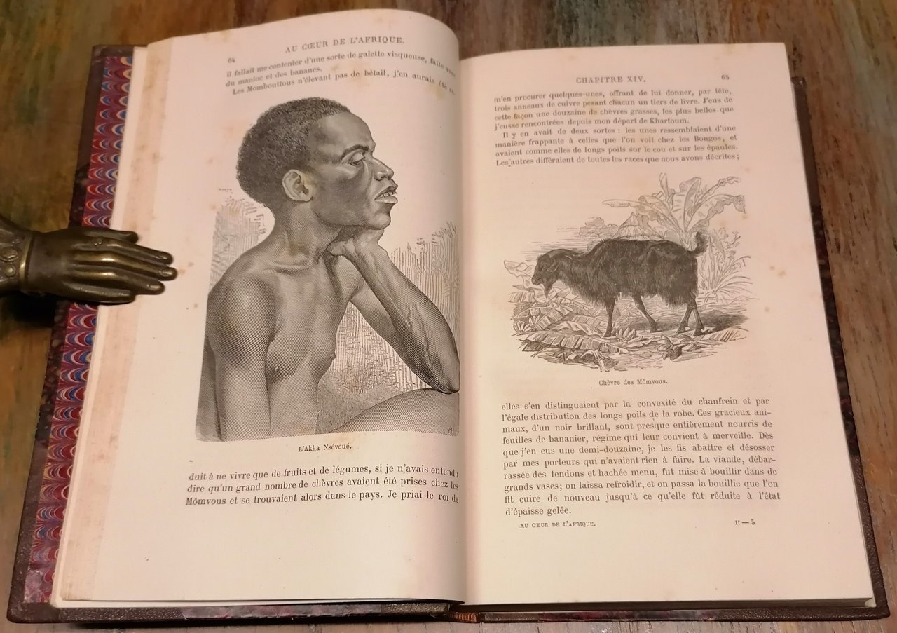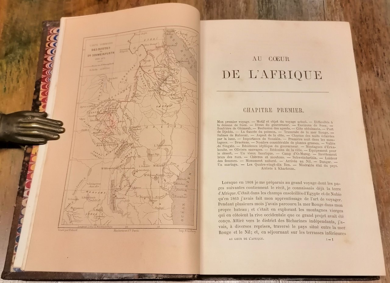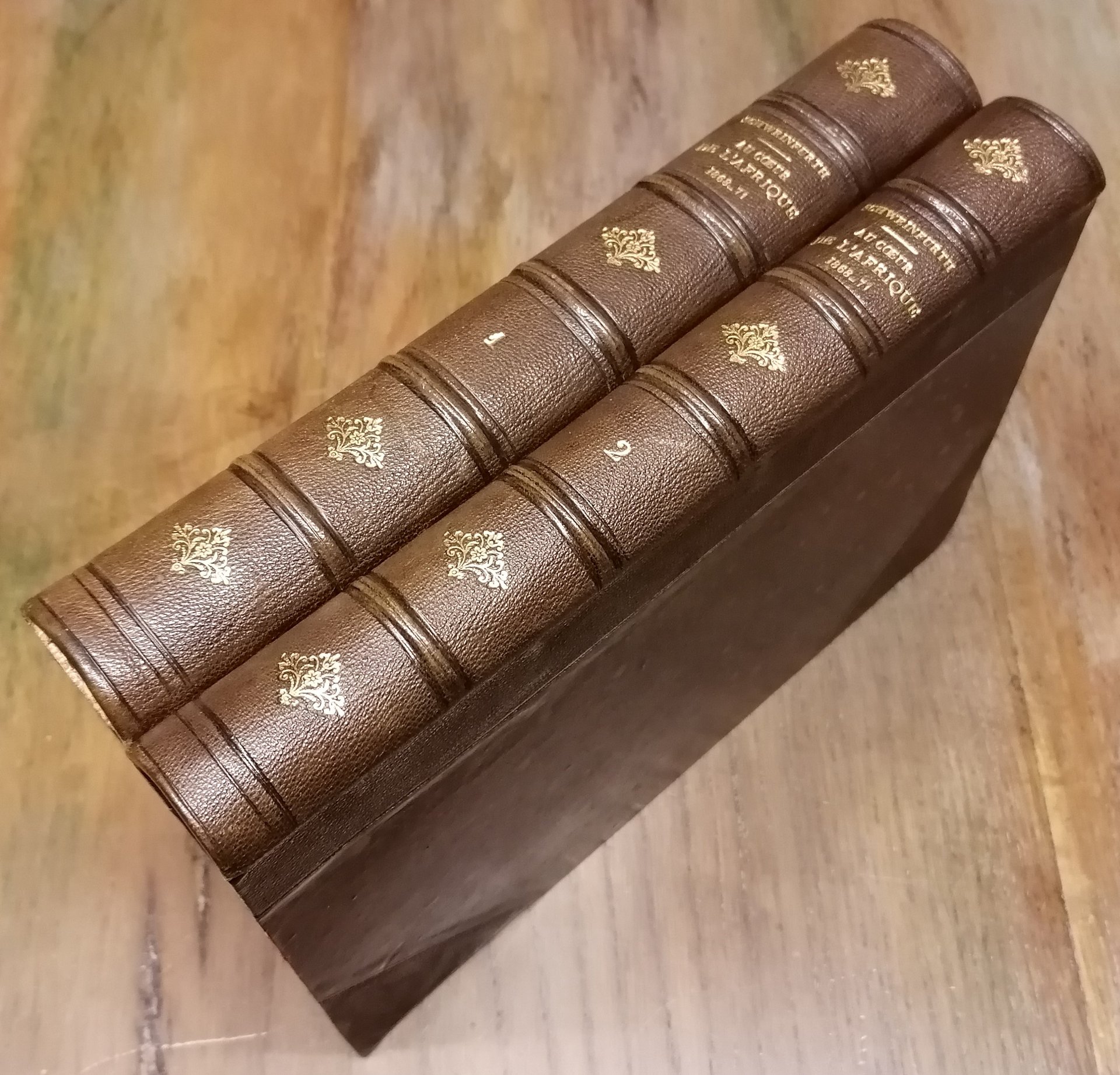 (Esplorazione dell'Africa - Viaggi - Esploratori austriaci dell'Ottocento - Sudan - Congo) Due volumi in 8°, legatura coeva in mezzo marocchino marrone con angoli e filetti dorati, dorsi a 5 nervi con titoli e fregi in oro, carte marmorizzate ai piatti ed alle guardie, pp. (4),IV,508 ; (4),434,(2), con complessive 139 incisioni in legno nel testo (anche a piena pagina) e 2 carte geografiche a colori fuori testo, di cui una più volte ripiegata. Prima traduzione in francese autorizzata dall' autore e condotta sulle edizioni inglese e tedesca da M.me H. Loreau. La relazione di viaggio nel Sudan egiziano dell'esploratore e naturalista tedesco Georg August Schweinfurth, con importanti osservazioni sul Bahr-el-Ghazal, l'alto Congo (Uelle) ed il complesso oro-idrografico della regione. Interessanti le notizie sulle popolazioni incontrate, in particolare i Niam Niam o Asande ed il popolo pigmeo degli Akka. Leggere e circoscritte tracce di ossidazione all'interno, piccolo strappetto composto alla carta ripiegata, peraltro ottimo stato di conservazione.
